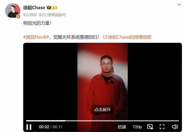 【真我Neo8觉醒光环系统重磅回归 侧边新增神秘按键】真我realme徐起宣布真我Neo8觉醒光环系统重磅回归,相信光的力量。而且从其预热视频来看,此次真我Neo8的觉醒光环系统可能会支持更多种配色可调,为用户带来了更多的趣味性。当然,从照度来看,可能全新的觉醒光环系统也会更加明亮。早在2023年2月,真我GT Neo5首发了觉醒光环系统,在充电、日常应用通知等功能上都有不同玩法,同时还支持25色自定义。在玩游戏的时候,比如打《王者荣耀》,不同击杀时刻会呈现不同的光效,带来了十足的电竞氛围感。不过到了后续的真我GT Neo6和真我Neo7上,真我就取消了觉醒光环系统,也成为了不少用户的遗憾。此次觉醒光环系统在真我Neo8上重磅回归,也增强了产品力,让真我手机拥有了更强的记忆点。而且从剪影图也能看出,真我Neo8中框上还新增了一颗神秘按键,或许会是觉醒光环系统的开关,也可能是AI或者游戏按键,值得期待。另外,根据真我手机官方公布出来的真我Neo8剪影图来看,其采用了方形的相机DECO设计,与真我GT7系列颇为神似。旁边则是觉醒光环系统,不过从轮廓来看此次光环并未做闭环设计,最左侧未进行设计,最右侧则有两个开口,个性化程度更高。至于说回归后的觉醒光环系统会有什么新的玩法?让我们拭目以待。性能方面,真我Neo8会搭载第五代骁龙8,跑分高达358万,带来了更强劲的性能。