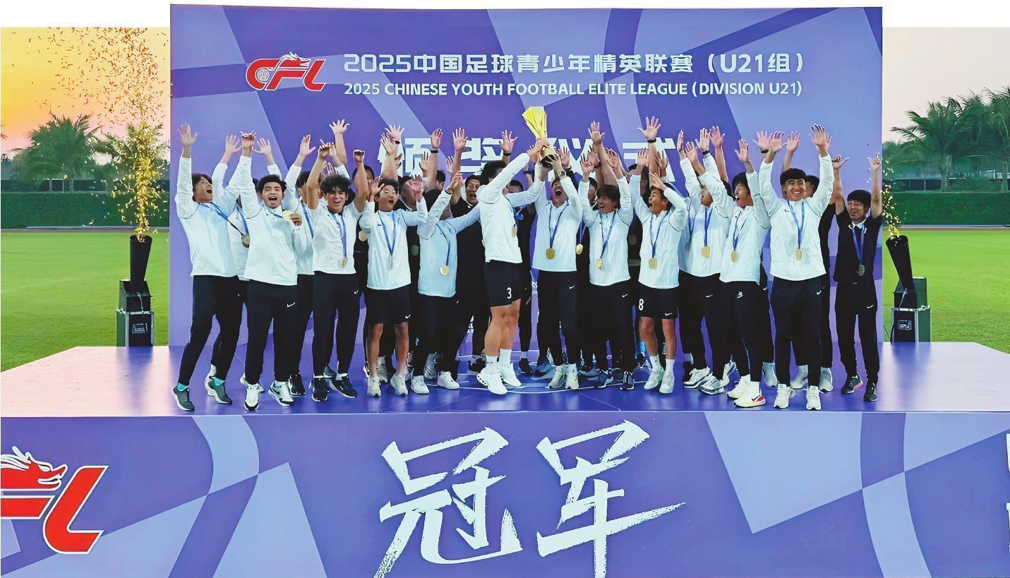 2025年12月7日,大连英博U21队捧起全国U21联赛冠军奖杯。大连英博足球俱乐部供图