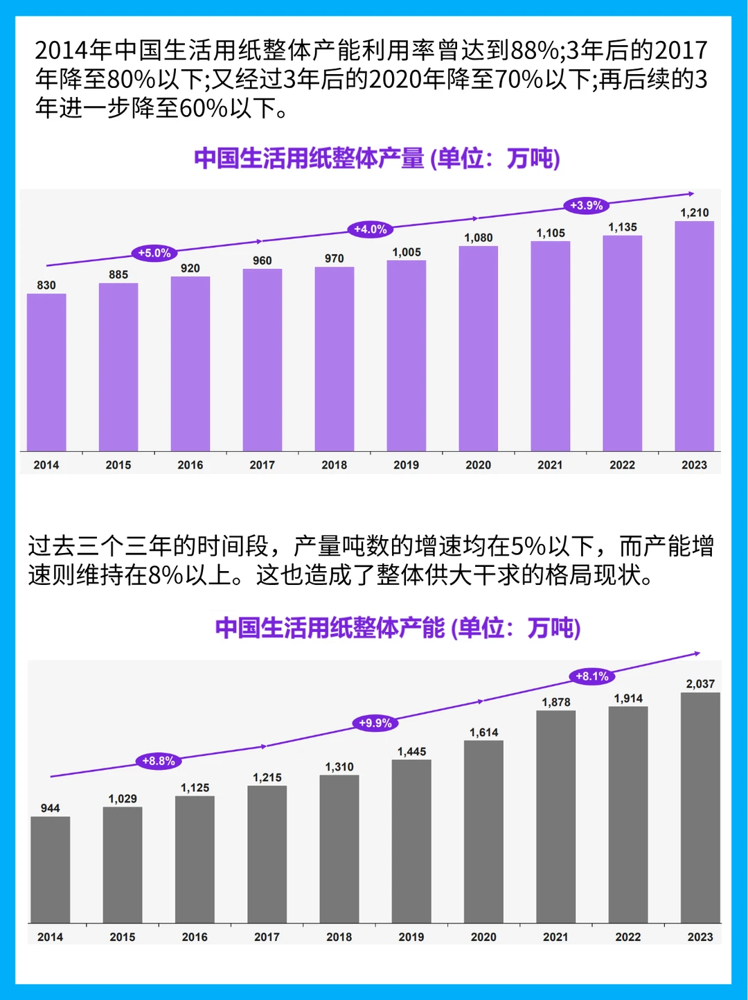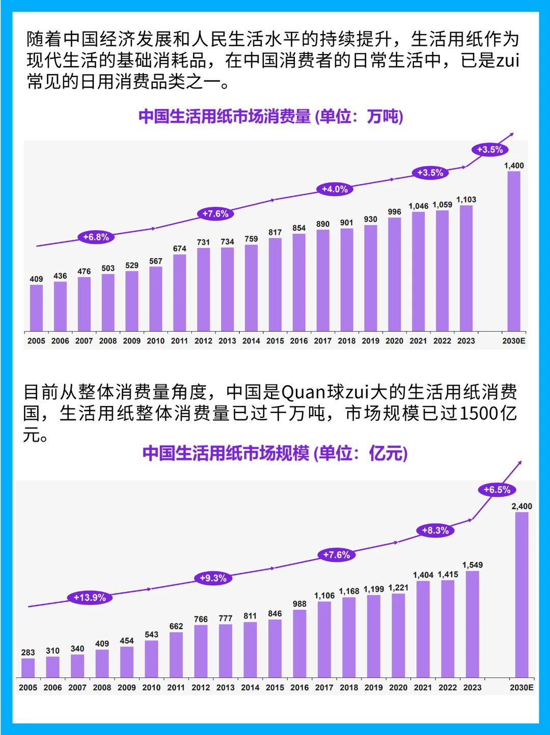 1️⃣ 市场规模爆炸增长:中国生活用纸消费量从2005年409万吨飙到2023年1103万吨,但人均用量(10.5kg)还不到美国(23.2kg)一半!