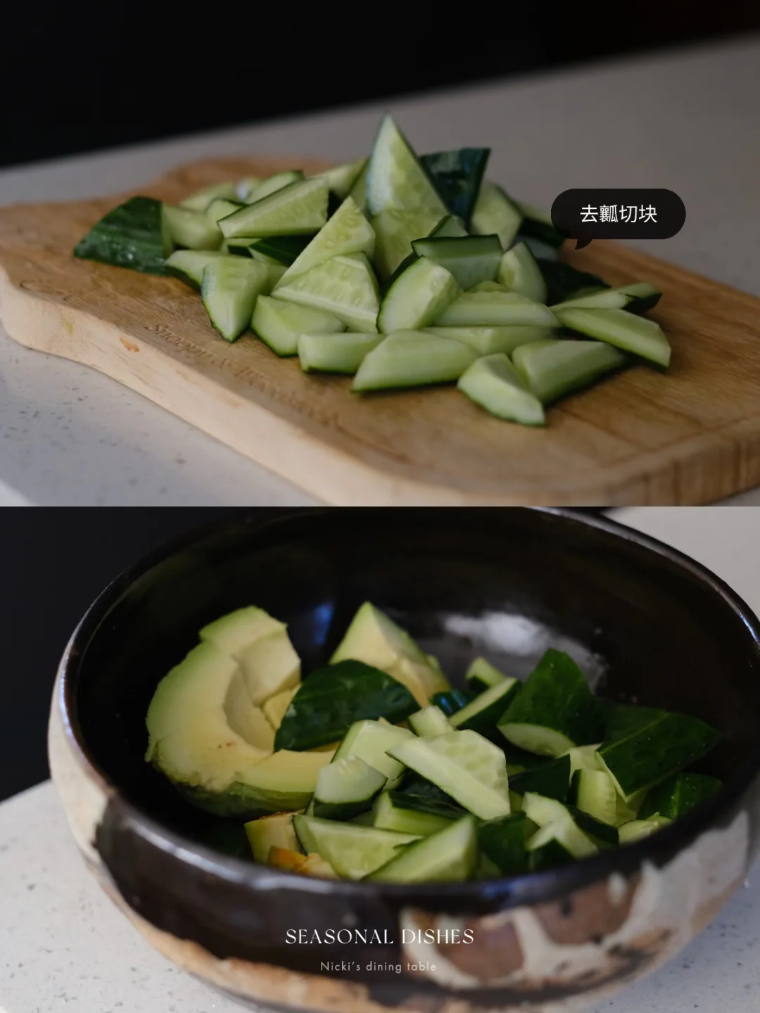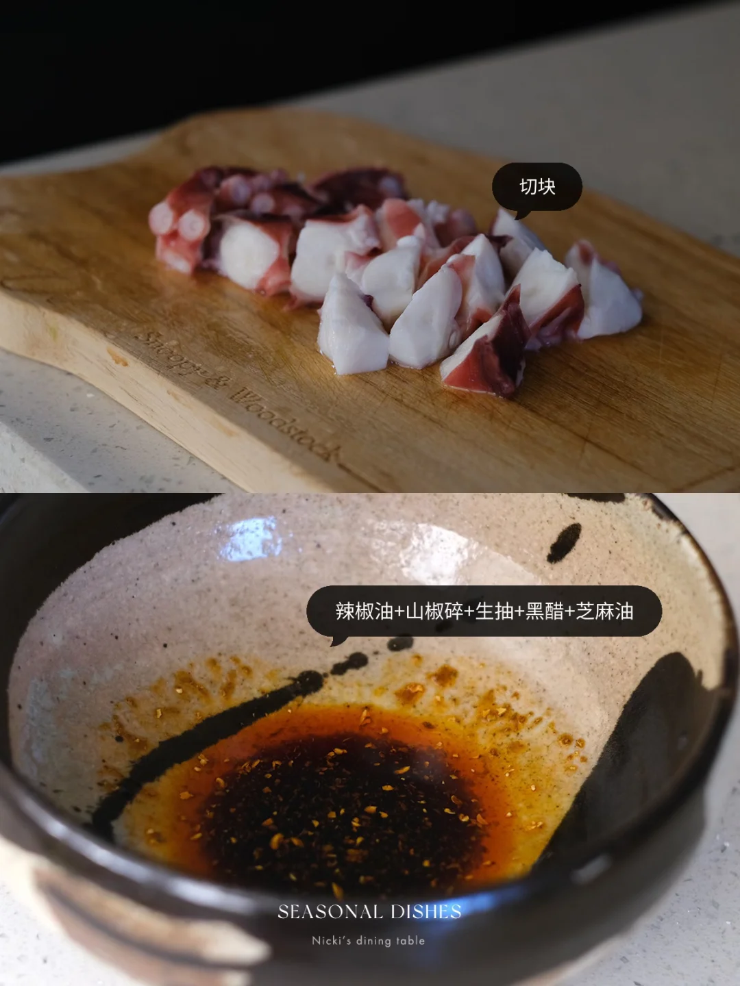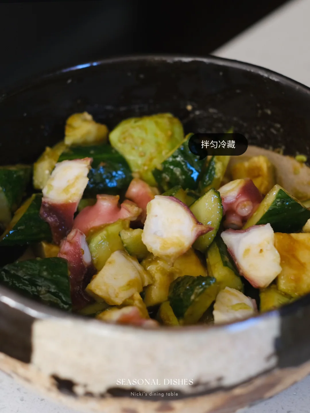 山椒相比花椒来说,不麻嘴,但香气十足。 - 菜谱:凉拌牛油果黄瓜章鱼腿 🔅做法: •牛油果去核去壳切小块。 •黄瓜去瓤,切小块。 ·章鱼腿热水汆烫取出浸冰水后切块。 🔺酱汁:辣椒油+山椒碎+生抽+黑醋+芝麻油 •将所有食材与酱料拌匀,时间允许可以放冰箱冷藏 日式餐桌|家庭料理| 器物之美|日本作家器|家常菜|晚餐吃什么|夏季餐桌
