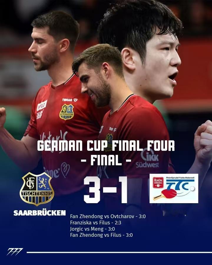 乒乓球德国杯决赛,樊振东所在的萨尔布吕肯对决富尔达马伯策尔,最终樊振东决赛中独得两分,帮助萨尔布吕肯以3-1的总比分击败富尔达马策尔成功夺冠,而在此前早些时候进行的半决赛中樊振东也出战了其中2场并全部获胜。值得一提的是,这是樊振东留洋生涯获得的首个冠军荣誉。 决赛首盘先以3-0横扫德国名将奥恰洛夫,随后的最后一局以3-0轻取削球手菲卢斯,赛后,樊振东也被颁予了德国杯决赛的MVP奖杯。