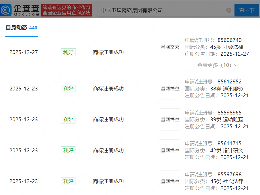 人民财讯1月5日电,企查查APP显示,近日,中国卫星网络集团有限公司成功注册星网空天、星网经纬、星网纵横等星网系列商标,国际分类涉及社会法律、设计研究、通讯服务等。