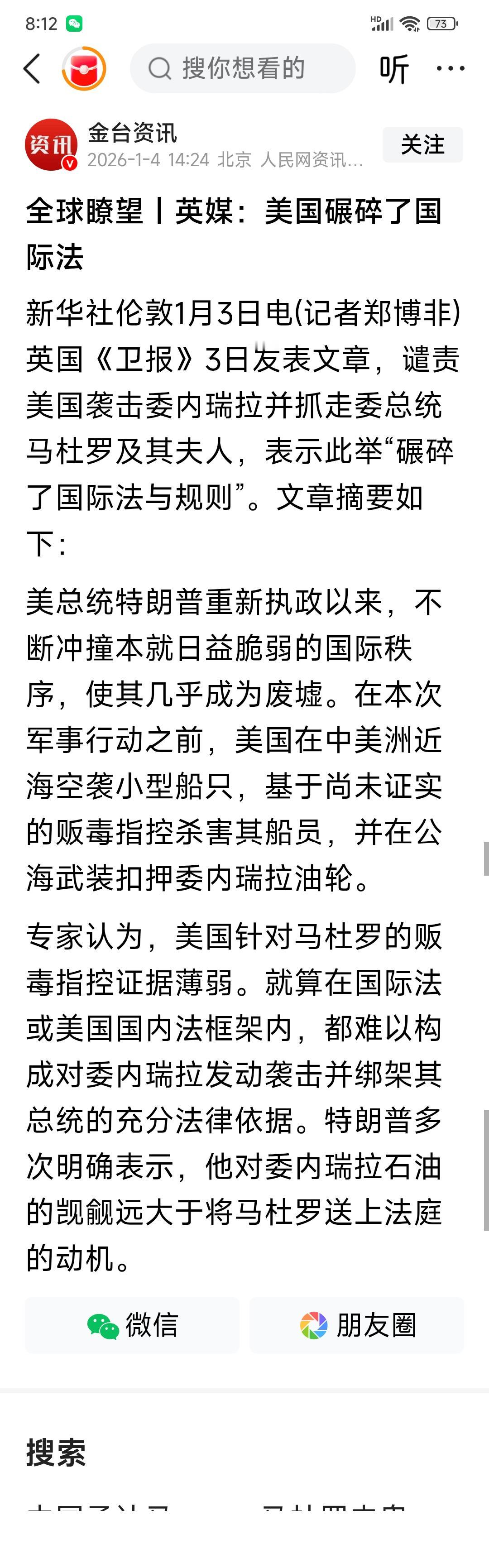 美国突袭委内瑞拉,抓捕马杜罗夫妇!俄罗斯谴责,中国谴责,巴西谴责! 自家人、美国纽约市长表示:美对委实施的打击违反国际法,构成战争罪! 英国《卫报》也发文,谴责美国对委内瑞拉实施的空袭以及对马杜罗总统的抓捕行动,声称此举“碾碎了国际法与规则”。 但这些有什么用呢?美军依然在世界各地横行霸道,依然在公海上查扣他国油轮!美国总统特朗普依然炫耀他的战果,甚至扬言要取代联合国! 在此次危机中,联合国真的像特朗普所说的那样“基本上没什么用”,对美国的霸凌行径视若无睹,听而不闻!古特雷斯屁都不敢放一个! 当今世界依然是赤裸裸的丛林社会!我们唯一能做的就是不断强大自己!