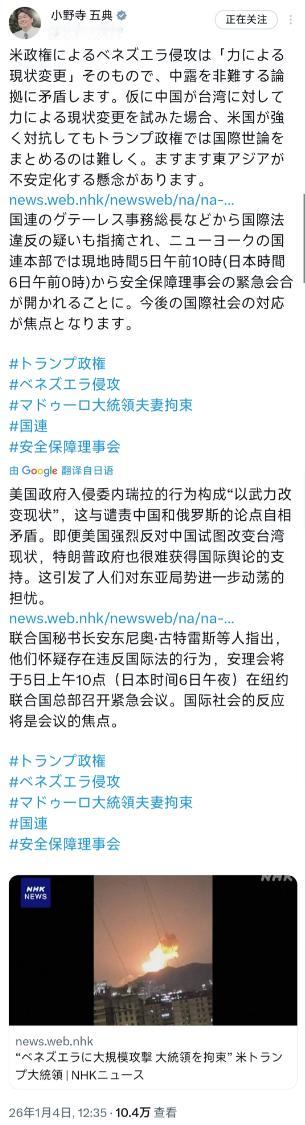 全是算计!1月4日,日本自民党政策调查会会长小野寺五典发文:“美国政府入侵委内瑞拉的行为构成‘以武力改变现状’,这与谴责中国和俄罗斯的论点自相矛盾。即便美国强烈反对中国试图改变台湾现状,特朗普政府也很难获得国际舆论的支持。这引发了人们对东亚局势进一步动荡的担忧。” 乍一看,还以为日本新保守派是站在了公平公正的立场,和东方大国站在了统一战线,但其实错了,他们只过是担心中国会用同样的方式实现台湾统一,最终让他们觊觎台湾的想法再次落空。 要知道,美国和委内瑞拉是两个独立的国家,美国抓捕其总统的行为是很明显的侵权行为,而台湾是中国的一部分,这是基于《开罗宣言》、《波茨坦公告》等的法理事实,美国用“武力”的方式干涉委国的内政,相当于是给中国打了个样,他们独立的两个国家都能这么做,更何况同属一中的大陆呢。 说实话,小野寺五典这次发言彻底暴露了日本的野心,他们一直都没放弃和中国争夺主权,但他们的想法也只能停留在想法阶段了,毕竟联合国都已经再次重申“一个中国”的原则,并且国际社会90%以上的国家也在坚持这一原则,并非是个别国家可以轻易改变的。 说到底,美国这种霸权行为,是对委国内政的侵犯。而台湾始终都是中国的台湾,中国捍卫国家主权和领土完整的决心坚不可摧,任何分裂图谋与外部干涉都注定失败。