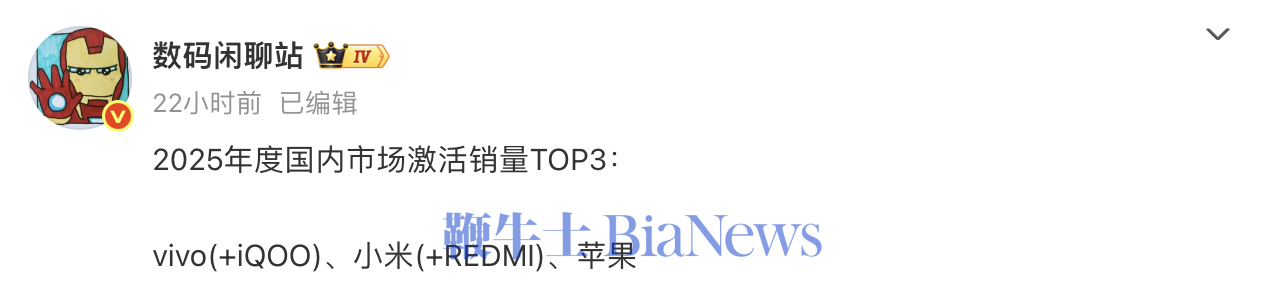 1月4日,数码博主“数码闲聊站”发文透露,2025年度国内市场激活销量TOP3分别是vivo(+iQOO)、小米(+REDMI)和苹果。