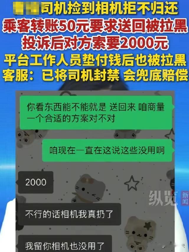 北京,付女士乘坐曹操出行网约车出行,下车后才发现自己价值3000多元且存有重要照片的相机落在了车上。付女士心急如焚,赶紧联系司机,为了能让司机把相机送回来,她先给司机转了50元定金,还承诺相机送到后再付50元。可司机收了钱后,竟直接把付女士拉黑了。付女士没办法,只能向平台投诉,没想到司机恶人先告状,不仅索赔2000元误工费等费用,还威胁要把相机扔掉。平台多次联系司机,甚至先行支付了费用,可司机再次拉黑平台。最终,平台无奈先垫付赔偿了付女士,并和付女士一起报了警。 (来源:纵览新闻) 当天,付女士乘坐网约车出行。一路上,她被窗外的风景吸引了注意力,完全没留意自己的随身物品,等她下车后,突然发现自己的相机不见了! 这相机可不一般,价值3000多元,而且里面还存着她许多重要的照片。那些照片或许记录着她生活中的美好瞬间,也有工作上重要的资料,都有着不可替代的意义。 付女士慌了神,赶紧想办法联系司机,好不容易联系上了,付女士为了能让司机把相机送回来,也是想尽了办法。 她先给司机转了50元作为定金,还诚恳地承诺,等相机送到自己手上后,再付50元作为报酬,她觉得这样司机应该会愿意帮忙把相机送回来吧。 可司机收完钱后,直接把付女士拉黑了,付女士再发消息过去,就显示消息被拒收了。 付女士这下可真是叫天天不应,叫地地不灵了,实在没有办法了,只能把希望寄托在网约车平台上,于是向平台进行了投诉。 平台接到投诉后,马上就开始联系司机。可司机不知道是怎么回事,不仅不配合,还恶人先告状。 他还索要2000元的误工费等费用,还威胁说如果不给钱,就要把相机扔掉。 平台的工作人员也是一头雾水,这司机怎么能这么不讲道理呢?但为了能尽快解决问题,平台还是多次联系司机,甚至为了安抚司机,先行支付了他索要的费用。 可司机根本就是个无赖,拿到钱后,再次把平台也拉黑了。 这下平台也无奈了,一边是着急的付女士,一边是耍无赖的司机。平台思来想去,为了不让付女士的损失进一步扩大,只能先垫付赔偿了付女士的相机费用。 平台也意识到这件事已经不是简单的纠纷了,于是和付女士一起报了警。 民警接到报案后,通过技术手段,很快就锁定了司机的位置。 在民警的压力下,司机终于意识到自己的错误,不得不把相机交了出来。 虽然相机最终是找回来了,但付女士这段时间可真是心力交瘁。她原本只是想顺利出行,却没想到会遇到这样的事情。 而平台也因为司机的行为,遭受了不必要的损失和麻烦。 根据《民法典》第三百一十四条规定,拾得遗失物,应当返还权利人。拾得人应当及时通知权利人领取,或者送交公安等有关部门。 司机捡到付女士的相机,本应该归还,可他却不仅不归还,还索要钱财,这已经违反了法律规定。 而且司机在收到付女士的定金后拉黑她,还向平台索赔并威胁扔掉相机,这种行为涉嫌敲诈勒索。 根据《刑法》第二百七十四条规定,敲诈勒索公私财物,数额较大或者多次敲诈勒索的,处三年以下有期徒刑、拘役或者管制,并处或者单处罚金。 虽然司机索赔的金额可能不一定达到数额较大的标准,但他的行为性质恶劣,严重侵犯了他人的合法权益。 平台,在这件事中也有一定的责任。平台作为网约车服务的提供者,有义务对司机进行管理和监督,确保司机遵守法律法规和平台规定。 平台在处理这件事时,虽然积极联系司机并先行垫付赔偿,但也应该加强对司机的教育和处罚,避免类似事件再次发生。 对于付女士来说,她在这件事中虽然遭受了损失,但她的做法是正确的。 她及时联系司机,向平台投诉,并保留好相关证据,最后在平台的帮助下报警,最终找回了相机。 乘坐网约车或者其他交通工具时,一定要保管好自己的随身物品。下车前最好检查一下,避免遗落。 如果遇到类似付女士这样的情况,一定要及时向平台投诉,并且保留好相关的证据,比如转账记录、聊天记录等。 如果平台处理不力,还可以向相关部门寻求帮助,维护自己的合法权益。