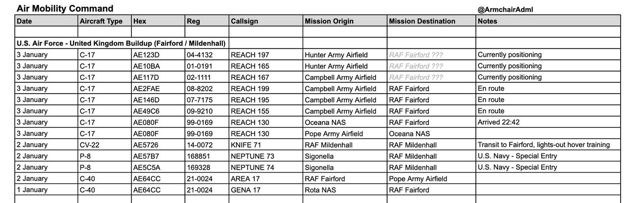 十几架美国C-17A“环球霸王III”运输机抵达英国皇家空军费尔福德基地,卸下了至少五架MH-60“黑鹰”直升机和一架MH-47G“支奴干”直升机(均来自美国空军第160特种作战航空团),以及数架CV-22B“鱼鹰”倾转旋翼机(来自美国空军第7特种作战中队)。目前尚不清楚此次集结是为了抓捕埃尔多安还是哈梅内伊。