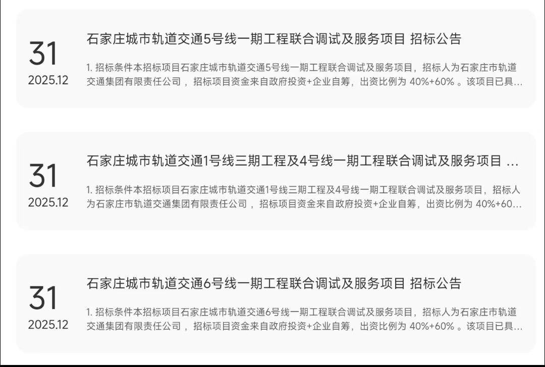 好消息,河北石家庄地铁最近迎来多项建设新进展,多条线路的开通时间与二期规划调整工作都有明确推进消息,以后出门坐地铁肯定超方便! 从石家庄轨道交通官网公示的招标公告可知,2025 年 12 月 31 日,石家庄城市轨道交通 1 号线三期工程及 4 号线一期工程、5 号线一期工程、6 号线一期工程的联合调试及服务项目相继发布招标公告!项目招标人均为石家庄市轨道交通集团有限责任公司,资金来源为政府投资与企业自筹,出资比例为 40% + 60%! 而且,各线路的开通运营时间也都明确了!1 号线三期预计 2026 年 11 月 30 日开通运营;4 号线一期、5 号线一期预计 2027 年 3 月 30 日开通运营;6 号线一期预计 2027 年 9 月 30 日开通运营。 此外,石家庄轨道交通二期规划调整中的 4 号线北延、S2 机场线也在积极推进中。未来石家庄地铁线网将进一步完善,市民出行将更加便捷! 以上有你特别期待的线路吗?让我们一起坐等石家庄地铁变得越来越好吧! 石家庄地铁建设 地铁线路开通时间