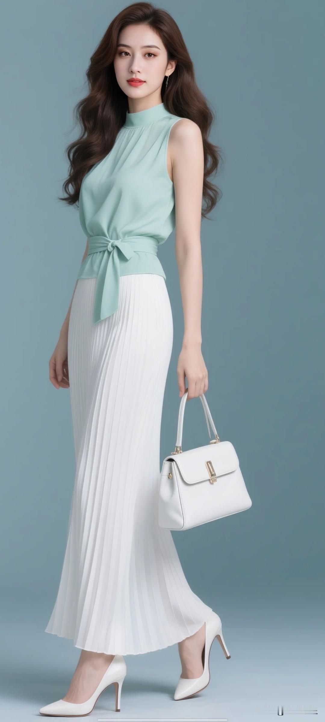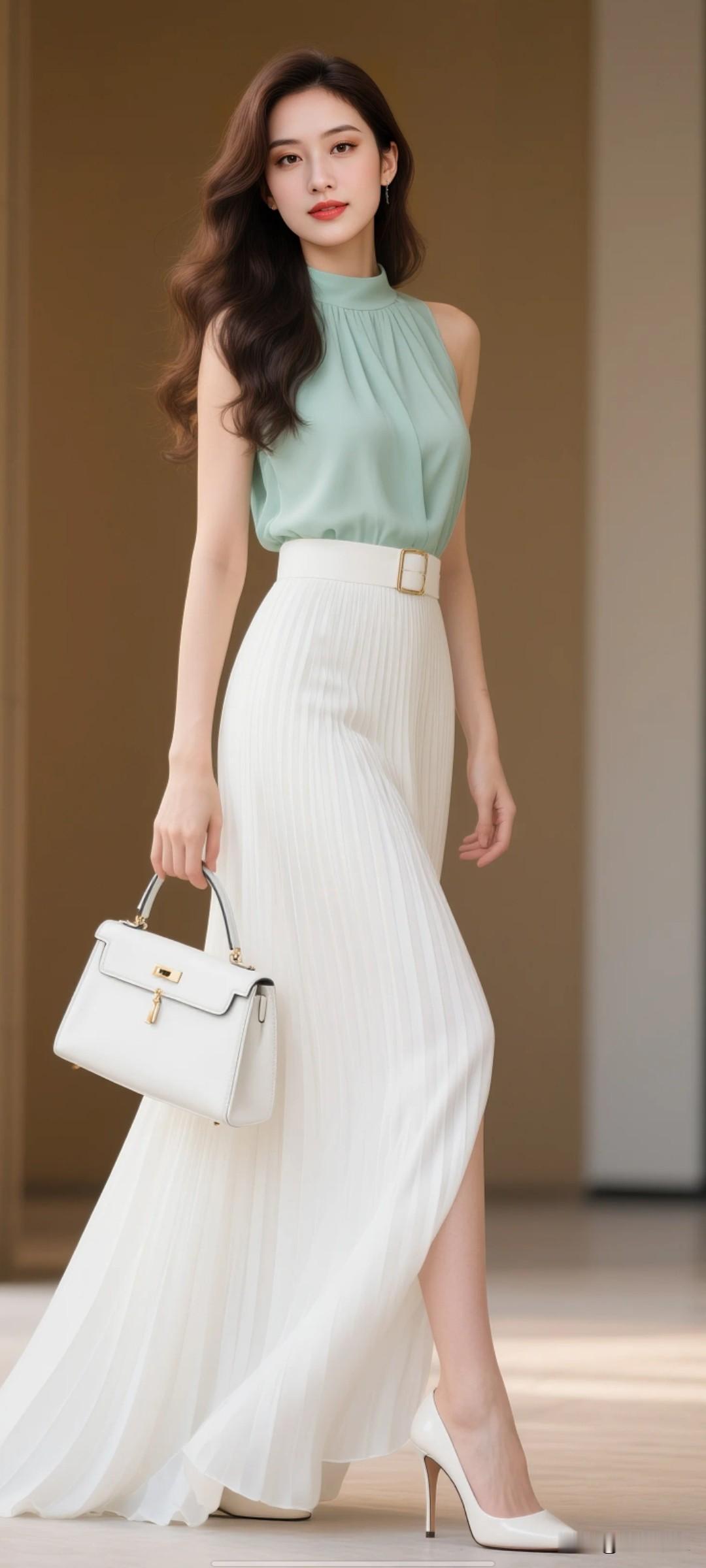 女生留着黑棕色长卷发,上衣穿薄荷绿无袖雪纺面料上衣,上衣有设计感腰带,白色真丝百褶拖地长裙。穿白色八厘米细跟高跟鞋,手提白色皮包。高清影视级别秀出你的靓丽倩影
