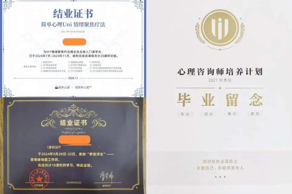 通过一位心理咨询师朋友推荐,她参加了一项两年长程心理咨询师培养计划和多项短程培训,并获得了心理咨询师专业技能证书。
