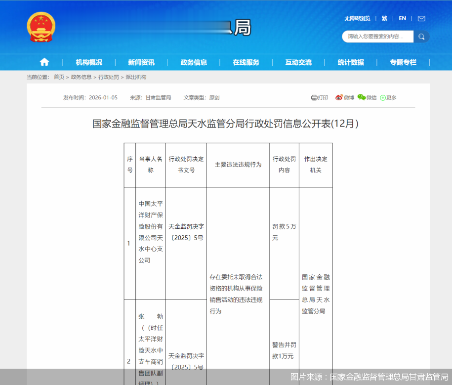 北京商报讯(记者李秀梅)1月5日,国家金融监督管理总局天水监管分局发布行政处罚信息显示,中国太平洋财产保险股份有限公司天水中心支公司,存在委托未取得合法资格的机构从事保险销售活动的违法违规行为,被罚款5万元。时任太平洋财险天水中支车商销售团队副经理张勃被警告并罚款1万元。