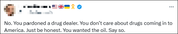 还有不少网民提到特朗普特赦被指控贩毒在美国服刑的洪都拉斯前总统胡安·奥兰多·埃尔南德斯,特朗普政府以“禁毒”为借口攻击委内瑞拉并不成立。有网民写道,“不。你赦免了一名毒贩。你并不关心毒品流入美国的事。老实说吧,你想要的其实就是石油,坦白吧。”
