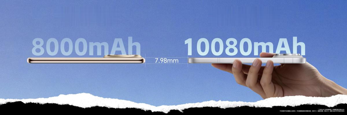 新一代荣耀Power2搭载行业最大10080mAh第四代青海湖电池,相比上一代增加高达2080mAh,续航表现再度突破行业极限,并在TÜV莱茵实验室的标准综合场景续航测试中斩获最长续航手机的佳绩。同时,通过将电池硅含量提升至15%,实现行业领先的926Wh/L能量密度,荣耀Power2将机身厚度精准控制在7.98mm,做到了让续航体验跨越式升级的同时,依然保持和上一代相同的超薄机身。