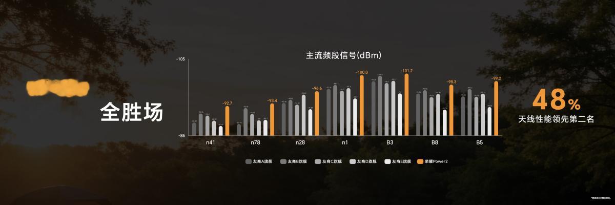 荣耀Power2搭载旗舰同款鸿燕六翼天线,并搭配荣耀自研射频增强芯片C1+,支持25根天线,100%的中框天线占比,多通道上下行覆盖能力均达到行业第一。同时,荣耀Power2不计成本行业首创了主流旗舰都未配备的平行双轨天线设计,打造了行业最强的低频超级四天线,弱网信号表现提升200%,通信表现超越行业主流旗舰机。凭借各项通信硬实力,荣耀Power2在电梯、地铁、高铁等弱信号及各类户外场景中,均能实现流畅通信不中断。其更以整机通过国家无线电监测中心检测中心(SRTC)电梯强信号与精准导航双场景五星认证的权威背书,实力印证“电梯信号王”称号。