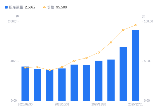 近一年(2024年12月31日至2025年12月31日),亚翔集成A股股东户数从1.78万户,增加至2.5万户,增幅40.58%,区间股价上涨261.47%。