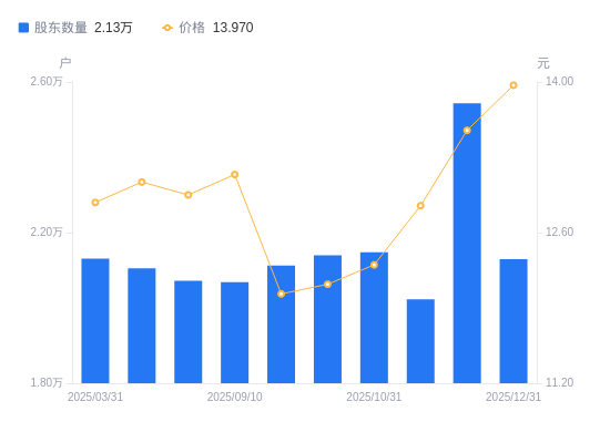 近一年(2024年12月31日至2025年12月31日),元祖股份A股股东户数从2.03万户,增加至2.13万户,增幅5.08%,区间股价上涨3.56%。