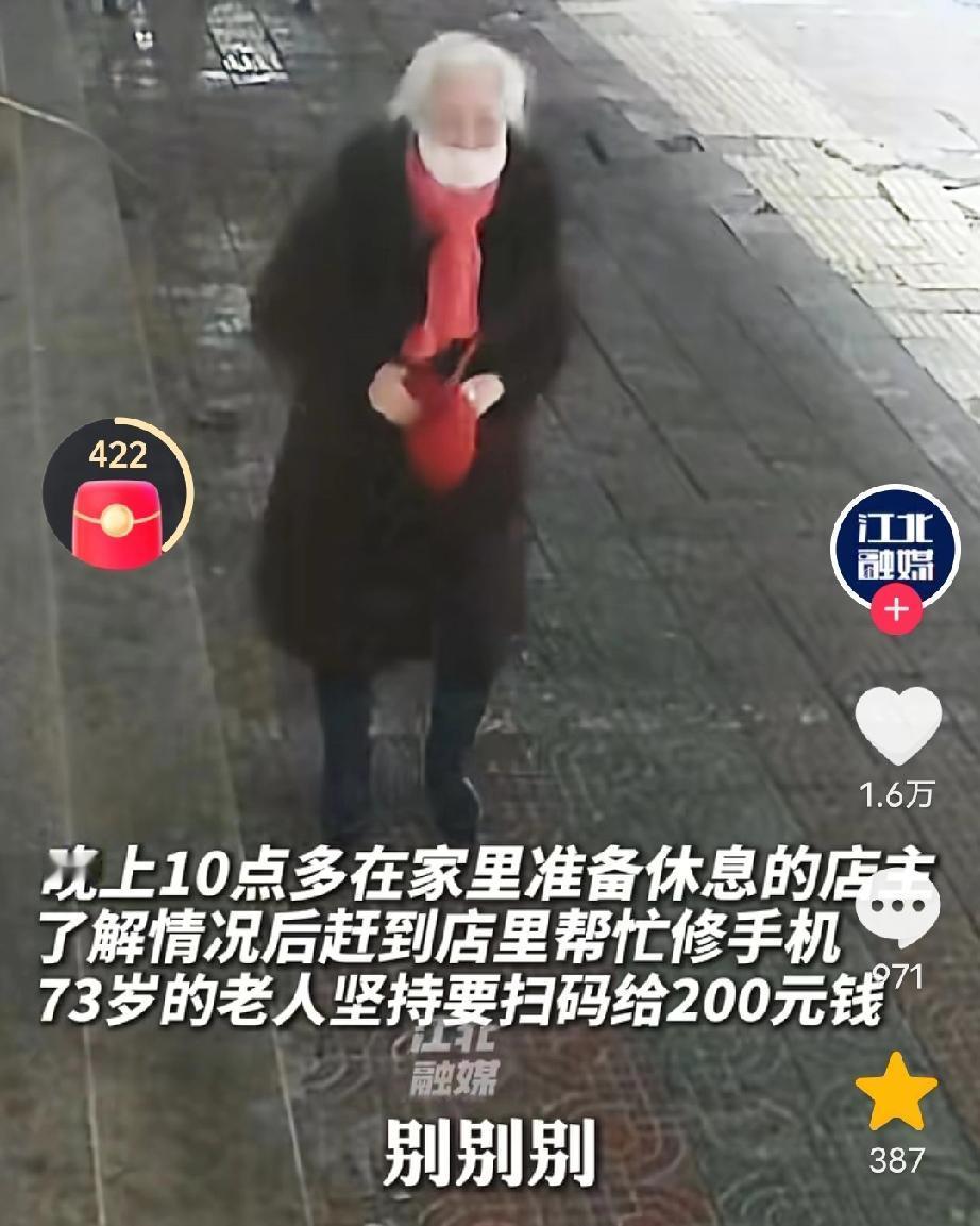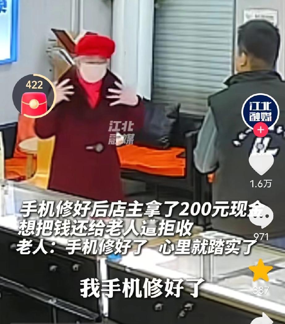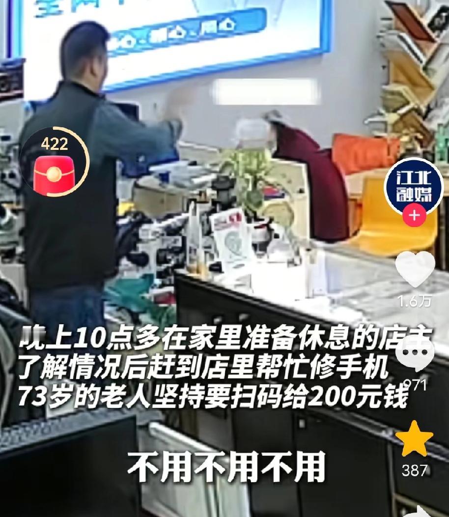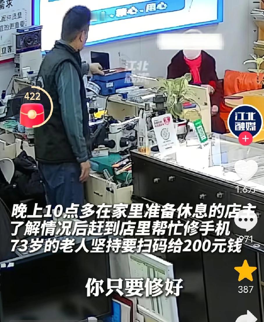 看哭了!江苏徐州,晚上10点了,手机维修店店主在家准备休息,不料电话铃声响了,接通后电话那头一老人说要修手机,本来店主想拒绝的,但听到老人哭着说出理由后,店主二话不说就打车返回到店里! 网友:“好说好商量,谁都愿意当个好人,恻隐之心,人皆有之!” 原来,这位老人今年73岁了,头发花白,但精神状态很好,老人有个19岁的孙子,在他很小的时候父母就离婚了,老人一手将孙子带大,可不幸的是孙子患有癫痫,当天晚上在玩手机时,手机不小心掉到水里损坏了。由于手机开不了机了,老人的孙子受到了刺激,直接犯病住进了医院。老人想着,如果手机修好了,孙子的病也就会好了。 当天,老人打了车来到这家修手机店门口,才发现手机店早已关门。 老人很失望,呆呆的站在门口。 她突然想起,自己曾在这家手机店修过手机,留有店主的手机号。 于是,就试着拨通了电话,她怕天太晚了店主不来,就说明了理由:“师傅,麻烦你个事,我打车来的,帮我修个手机吗?我孙子有癫痫病,犯病了…” 然而,老人还是担心自己怎么说,店主也不会来,说着说着就哭了。 “孙子的手机掉水里了,你在哪里打车过来,车钱我帮你付,别人都关门了…,呜呜呜…手机好不了,我孙子也好不了,他脑子受刺激了…” 店主听到这里,心里很不舒服,当即表示自己会来,让老人在门口等一下。 老人看见店主来了,她的心一下子落地了,赶紧弯腰致谢。 店主开门后赶紧接过手机修了起来,并说明手机问题不大,很好解决。 老人拿出手机对着收款码,说:“我给你扫200块钱。” 店主连忙说:“不用,不用,我不是为了钱而来的。” 老人说:“没事,没事,只要能修好救我孙子就行,耽误你休息了,师傅,我再次谢谢你!” 说完,老人摘下帽子对着店主深深的鞠了一躬。 这时,手机修好了,店主拿出了200块钱准备还给老人:“我不收你钱,要不是我看你年龄大,我都不来了。” 还没等店主从柜台内走出来,老人有点急了,摆摆手说:“你给我钱,我就撕了,只要我孩子醒了,我就踏实了。” 之后,店主说,本来不想要钱的但老人还是给了,老人也不是那种占便宜的人,自己想着送她回去,老人也不让送。 对此有网友说:“人的素质是一辈子的事,给这位明事理的老人点赞!” 也有网友说:“文明说话,礼貌待人,做什么都是值得的。” 或许在外人看来,这只是深夜的一笔维修生意,但在那一刻,店主明白,他修好的不仅仅是一部进水的手机,更是一位老人快要破碎的希望。 这件事之所以让无数网友破防,是因为它太真实,也太温暖了。 老人的“固执”,让我们看到了老一辈人的体面和修养——哪怕再难,也不愿亏欠别人的好意;店主的“仗义”,让我们看到了普通人骨子里的善良。 在这个快节奏的社会里,我们习惯了权衡利弊,习惯了“事不关己”。 这件事情让我们明白:善意是会流动的。 愿我们每个人在遇到难处时,有人愿意伸出援助之手,也愿我们在别人求助时,都能哪怕多一点点的耐心和恻隐之心。 因为,有时候你伸出的那双手,真的能撑起一个人心里的天。