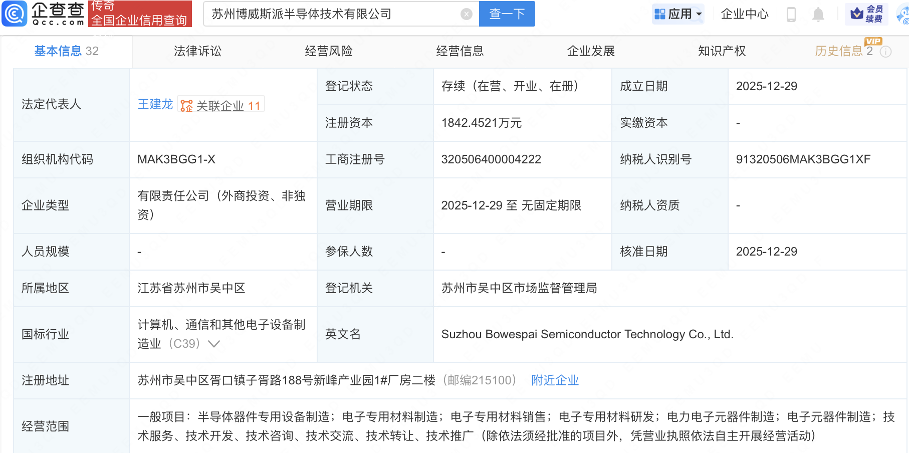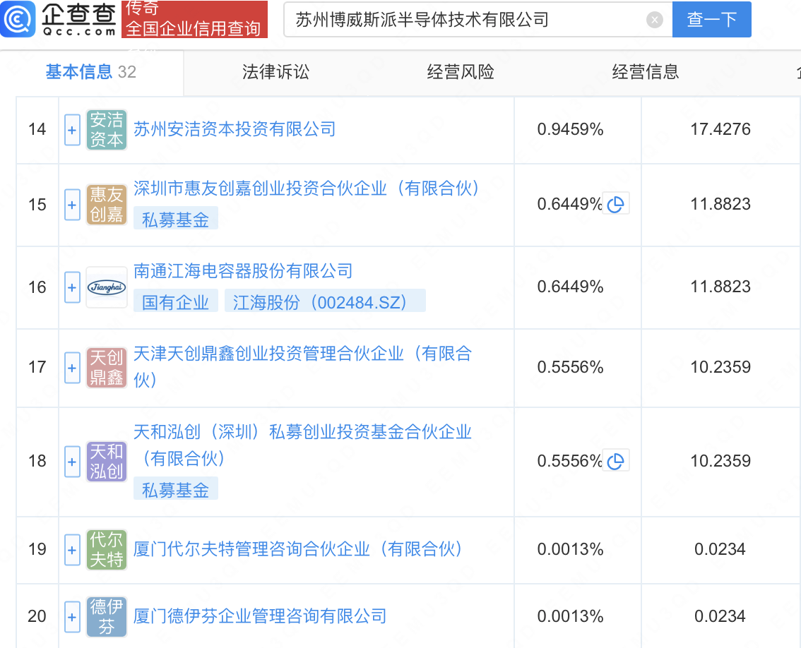 企查查APP显示,近日,苏州博威斯派半导体技术有限公司成立,经营范围包含:半导体器件专用设备制造;电子专用材料制造;电子专用材料销售;电子专用材料研发等。企查查股权穿透显示,该公司由江海股份(002484)等共同持股。