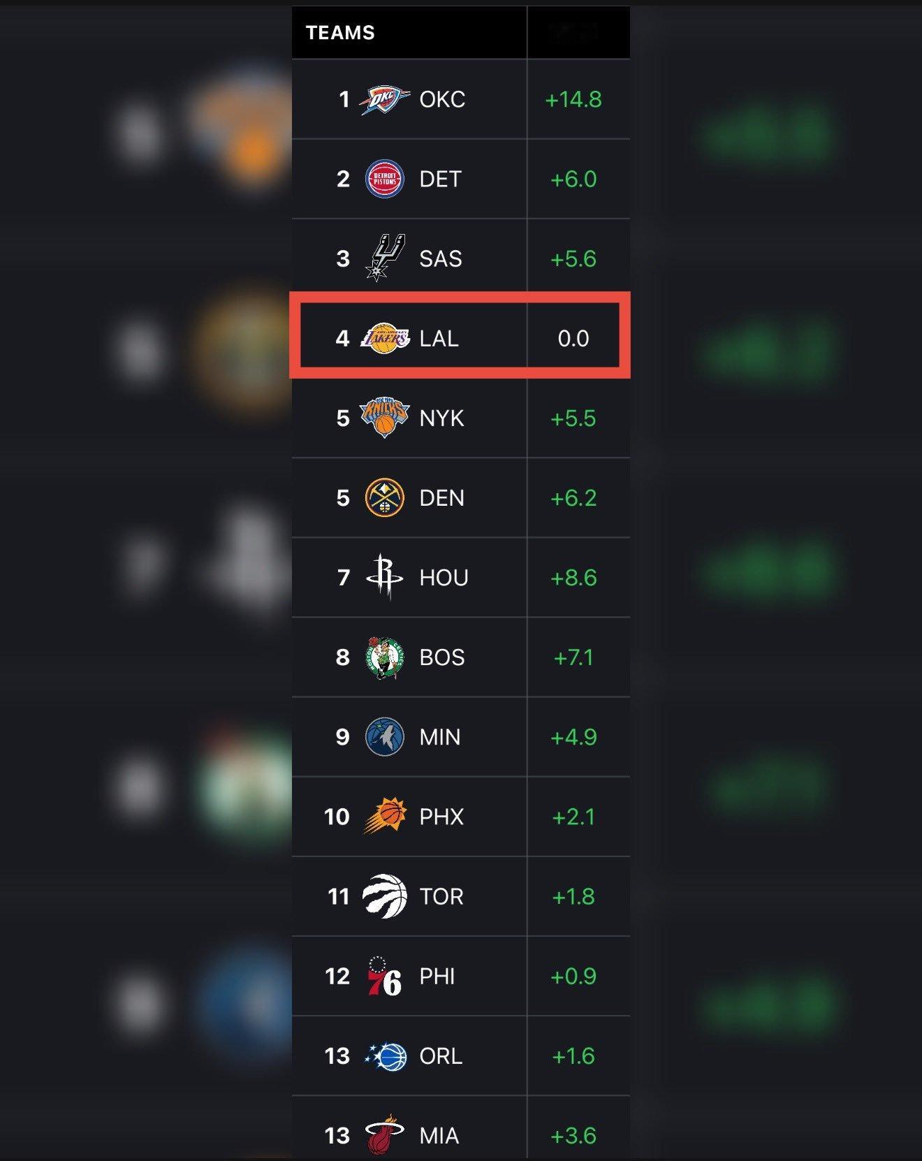 据统计,本赛季湖人全队总得分3870分,全队总失分3870分。所以他们的净胜分正好是0.0 😭洛杉矶湖人