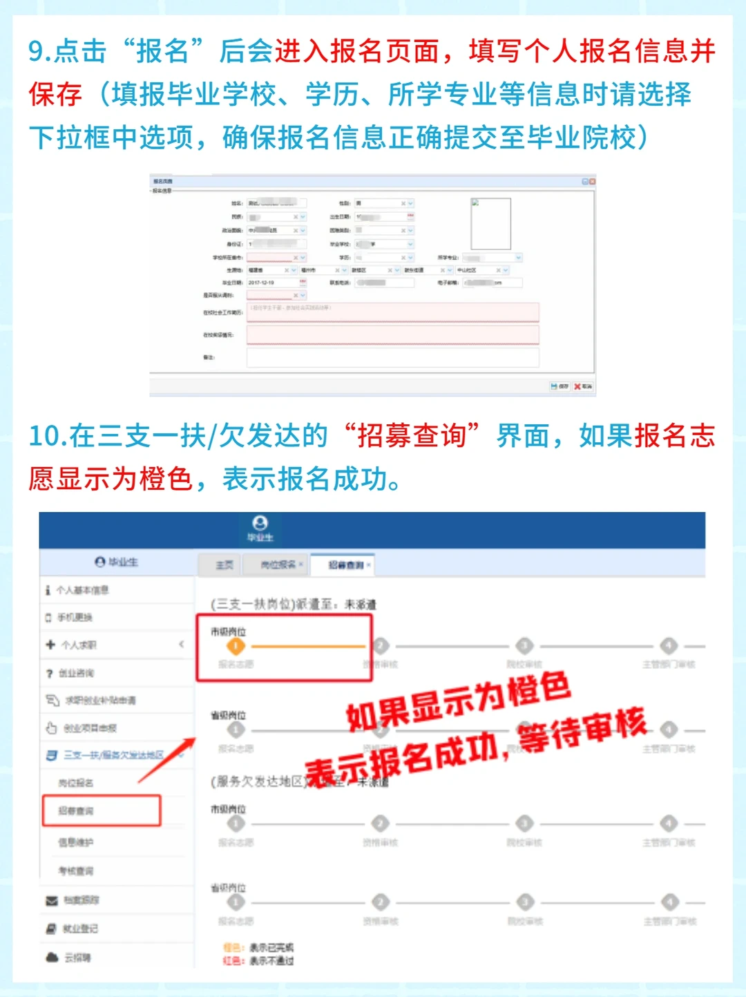 🌸10.在三支一扶/欠发达的“招募查询”界面,如果报名志愿显示为橙色,表示报名成功。