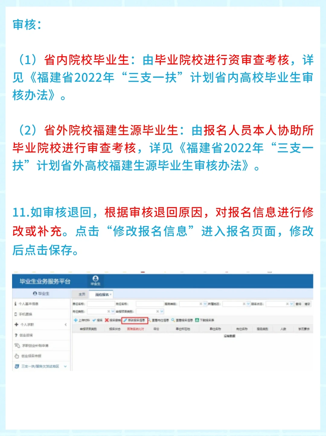 (1)省内院校毕业生:由毕业院校进行资审查考核,详见《福建省2022年“三支一扶”计划省内高校毕业生审核办法》。