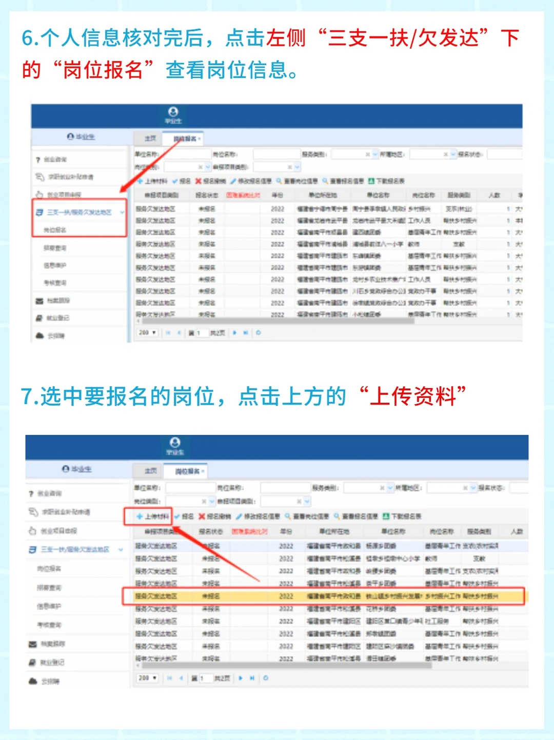 🌸6.个人信息核对完后,点击左侧“三支一扶/欠发达”下的“岗位报名”查看岗位信息。