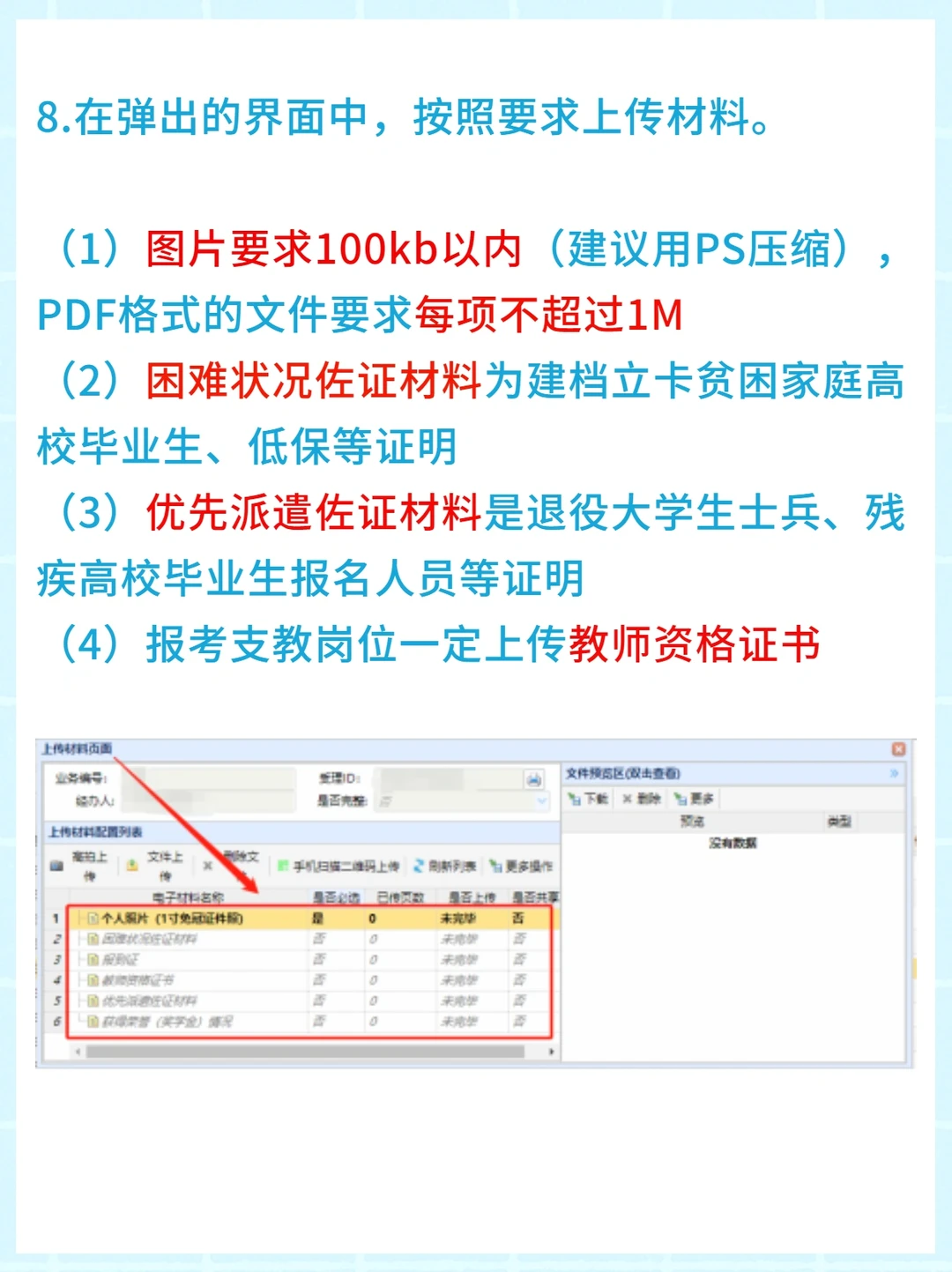 (1)图片要求100kb以内(建议用PS压缩),PDF格式的文件要求每项不超过1M