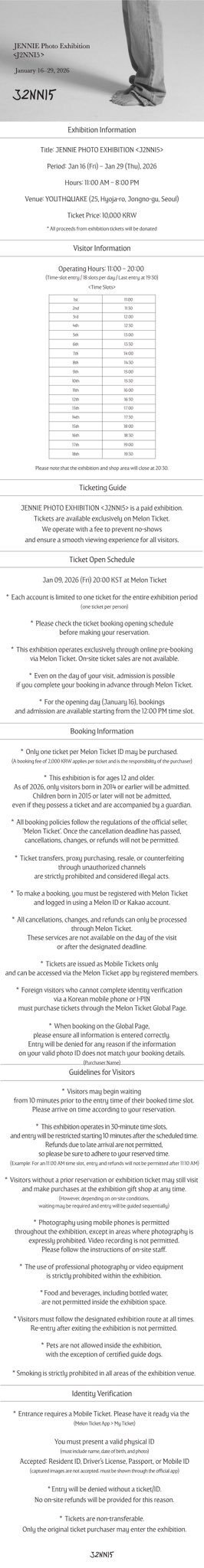 260105 OA更新Jennie首次个人摄影展购票+入场须知📸JENNIE摄影展门票预订及参观信息- 展期:2026年1月16日(星期五) - 2026年1月29日(星期四)时间:上午11点至晚上8点(韩国标准时间)- 地点:YOTHQUAKE(首尔市钟路区孝子路25)门票:10,000韩元- 门票预订网站:Melon Ticket (网页链接)- 门票开售日期:2026年1月9日(星期五)晚上8点(韩国时间)