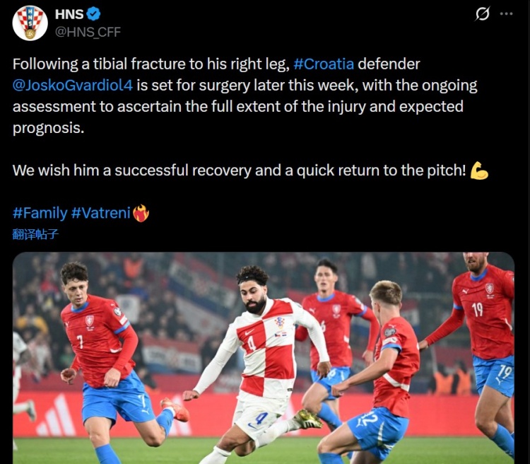 克罗地亚足协写道:“由于右腿胫骨骨折,克罗地亚后卫格瓦迪奥尔定于本周晚些时候接受手术。目前的评估工作仍在进行中,以确定伤情的严重程度以及预后。”