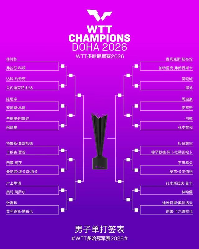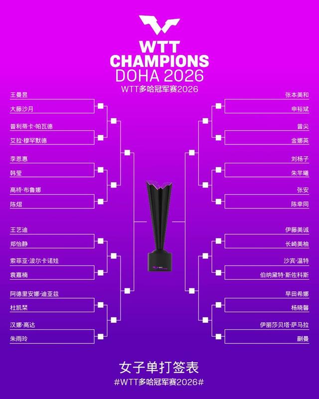 北京时间1月5日晚,2026年WTT多哈冠军赛抽签仪式举行,作为新赛季WTT系列赛的揭幕战,这场单打顶级赛事将于1月7日至11日在卢赛尔体育馆展开。国乒因孙颖莎、王楚钦缺席,以王曼昱、林诗栋为头号种子的10人阵容出征。女单包揽前四号种子占得分组优势,男单却陷入扎堆困境,内战与强敌夹击并存,挑战空前。