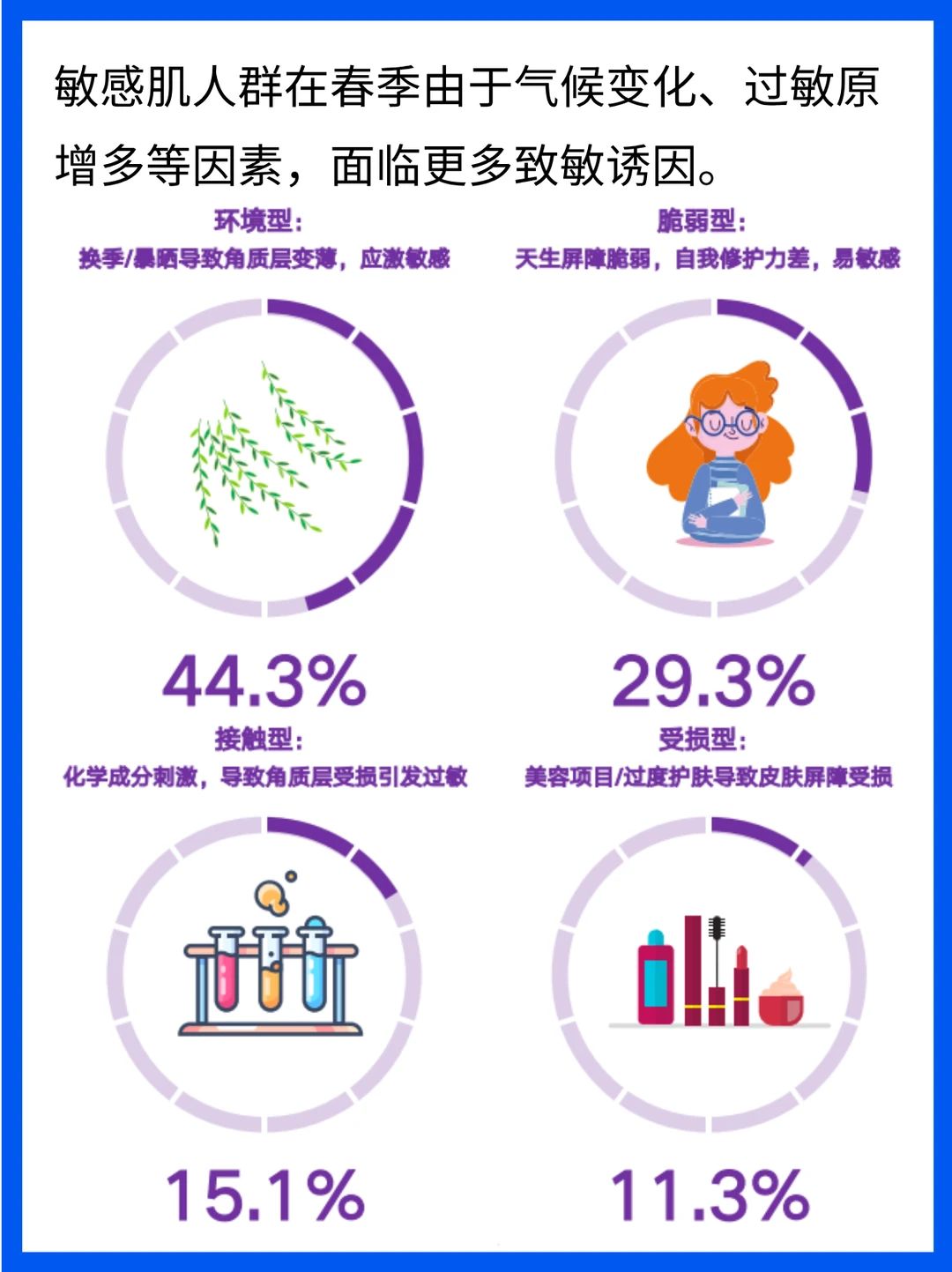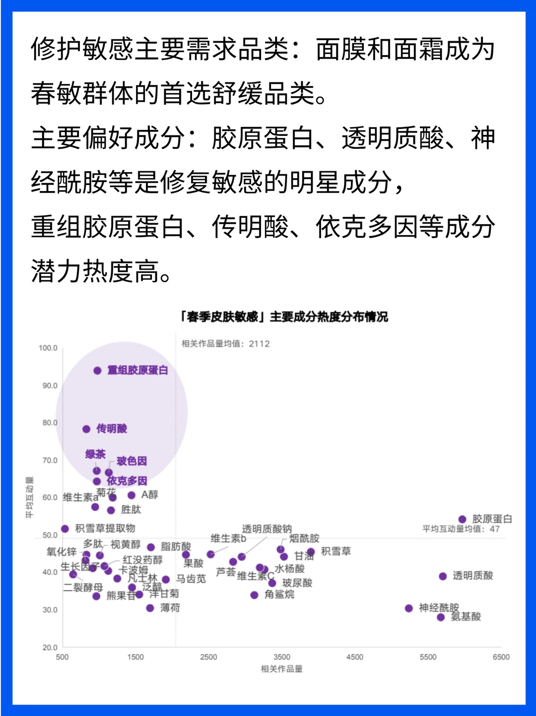 敏感肌人群偏好天然、无刺激成分,如胶原蛋白、透明质酸、神经酰胺等,注重产品安全性和功效。主要需求品类为面膜和面霜,关注急救、修护周期等痛点。