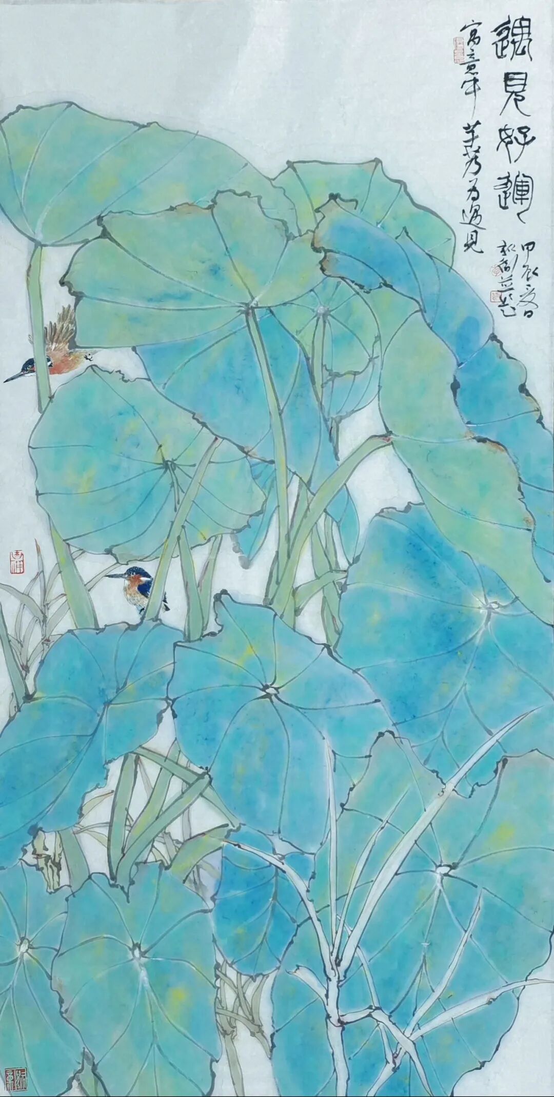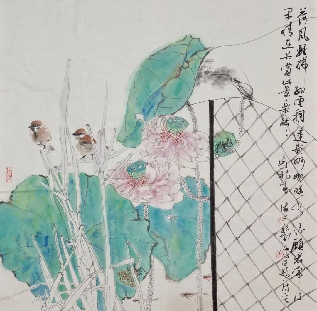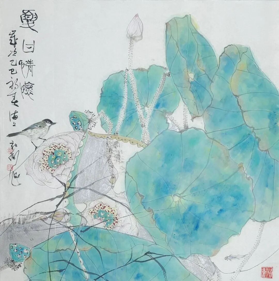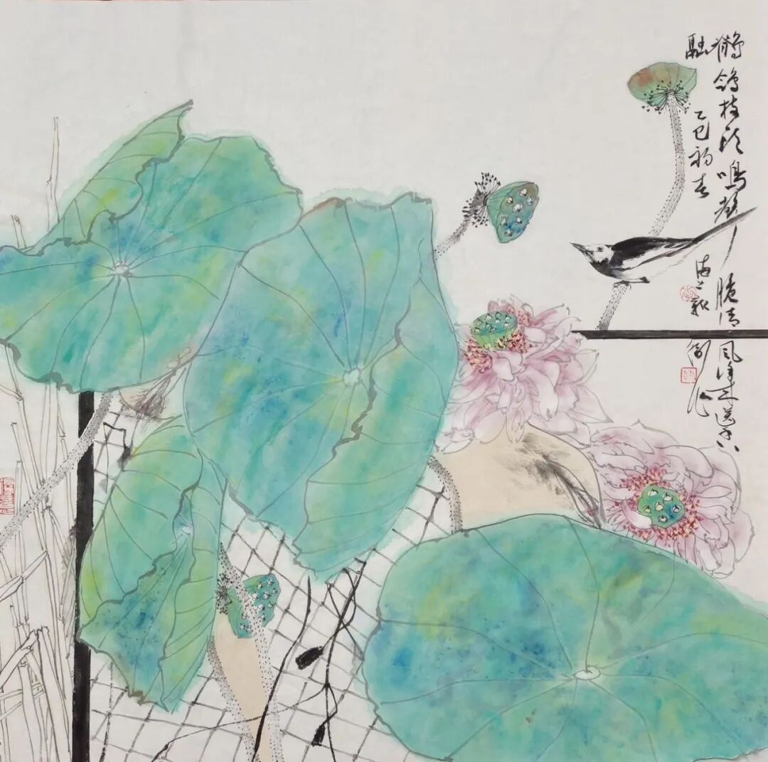李新卫钟爱于翠绿,他认为像翡翠的满绿,有质感、有厚度、有流动感,让人心旷神怡。翠绿在他的作品中屡屡以各样的姿态呈现。在创作上他追求线条、造型、构图、色彩搭配的唯美,他笔下的花鸟清秀俊逸、雅致恬荡,生机勃勃又不事喧嚣,在细腻的变化中透出禅意与清丽的审美追求。