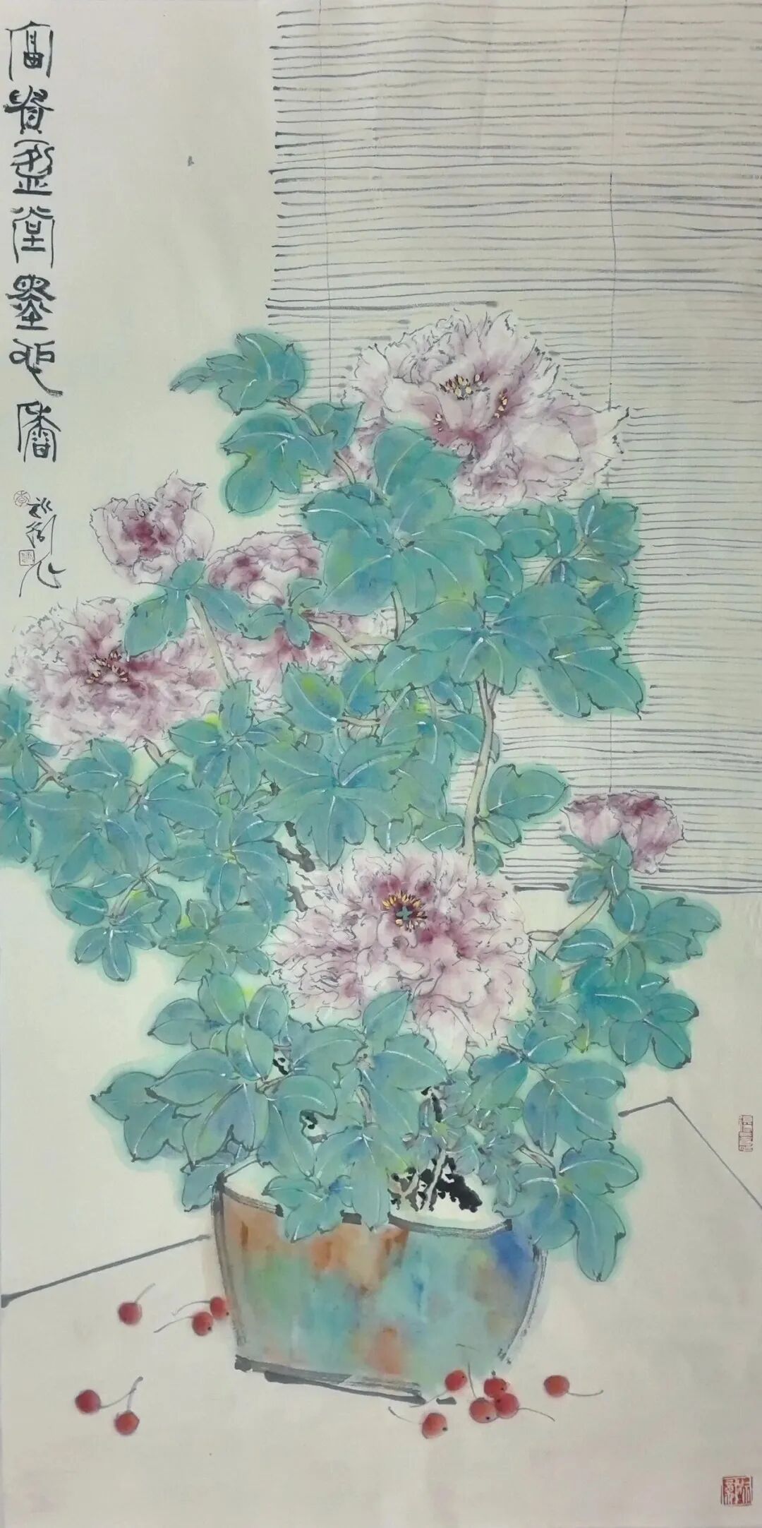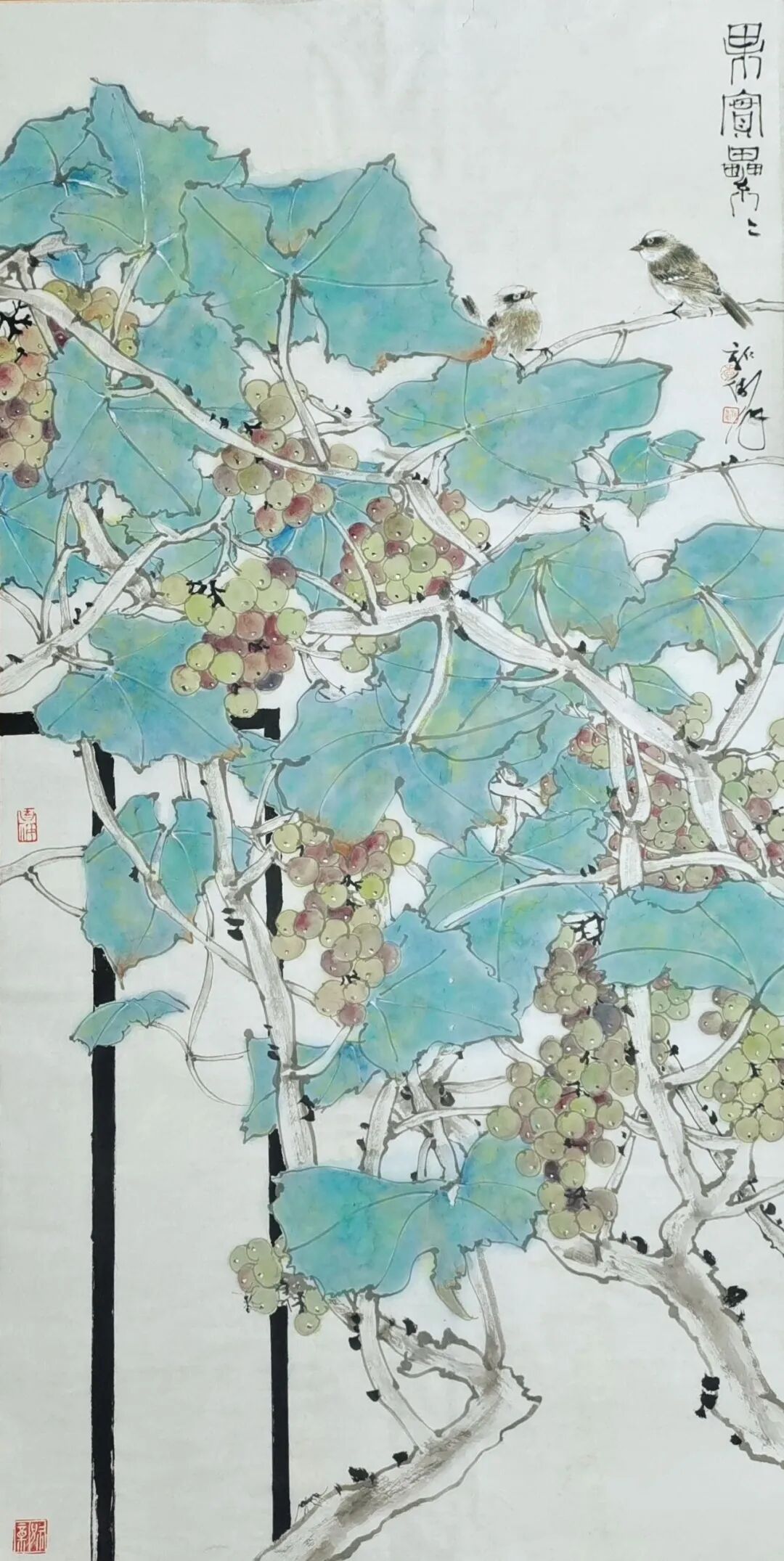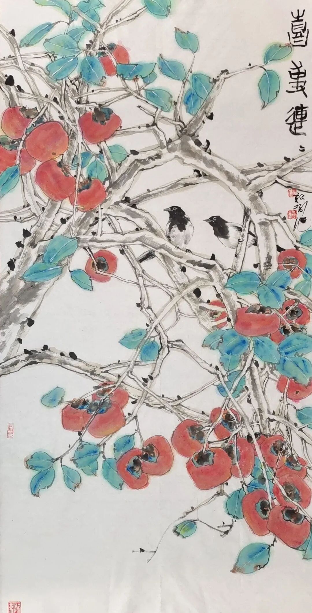 李新卫钟爱于翠绿,他认为像翡翠的满绿,有质感、有厚度、有流动感,让人心旷神怡。翠绿在他的作品中屡屡以各样的姿态呈现。在创作上他追求线条、造型、构图、色彩搭配的唯美,他笔下的花鸟清秀俊逸、雅致恬荡,生机勃勃又不事喧嚣,在细腻的变化中透出禅意与清丽的审美追求。
