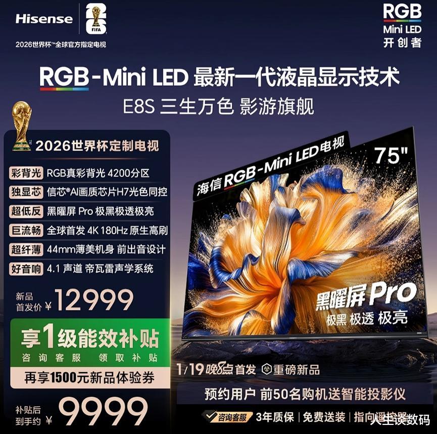 令人惊喜的是,海信E8S提供75/85/100英寸三种规格,叠加国家补贴后75英寸版本仅需9999元。这种厚道定价,让更多家庭有机会拥抱下一代显示技术。