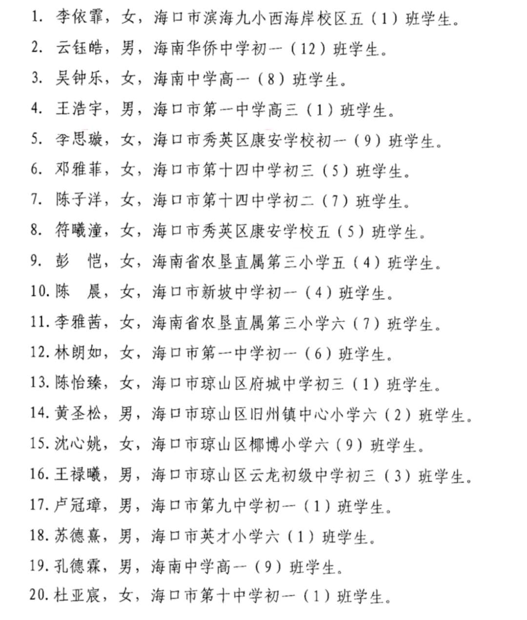 2025年度海口市“新时代好少年”名单。中共海口市委精神文明建设办公室供图