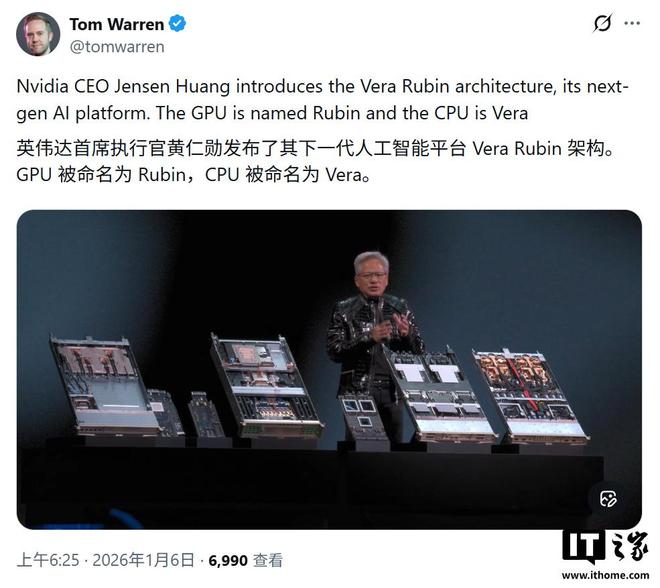 IT之家1月6日消息,在今天举办的CES2026主题演讲中,英伟达首席执行官黄仁勋发表主题演讲,介绍了新一代“Rubin”计算架构,并将其定义为当前AI硬件领域的“最先进技术”,该架构已进入全面量产阶段。