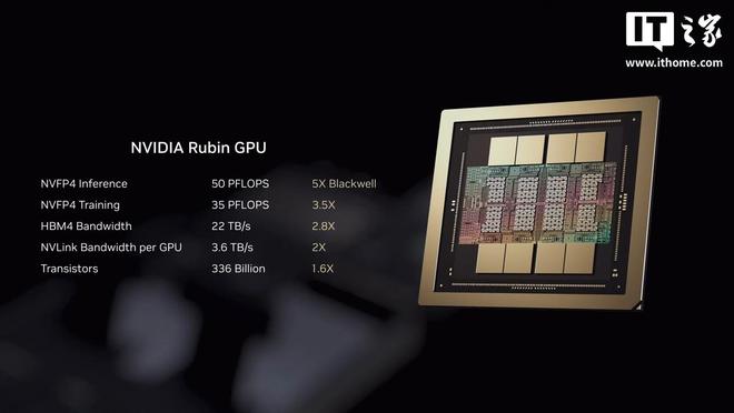 在性能表现方面,IT之家援引博文介绍,Rubin架构相较于前代产品实现了显著跨越。根据英伟达官方测试数据,Rubin在AI模型训练任务上的运行速度是Blackwell架构的3.5倍;在推理任务中,其速度更是达到了前代的5倍,峰值运算能力高达50Petaflops。