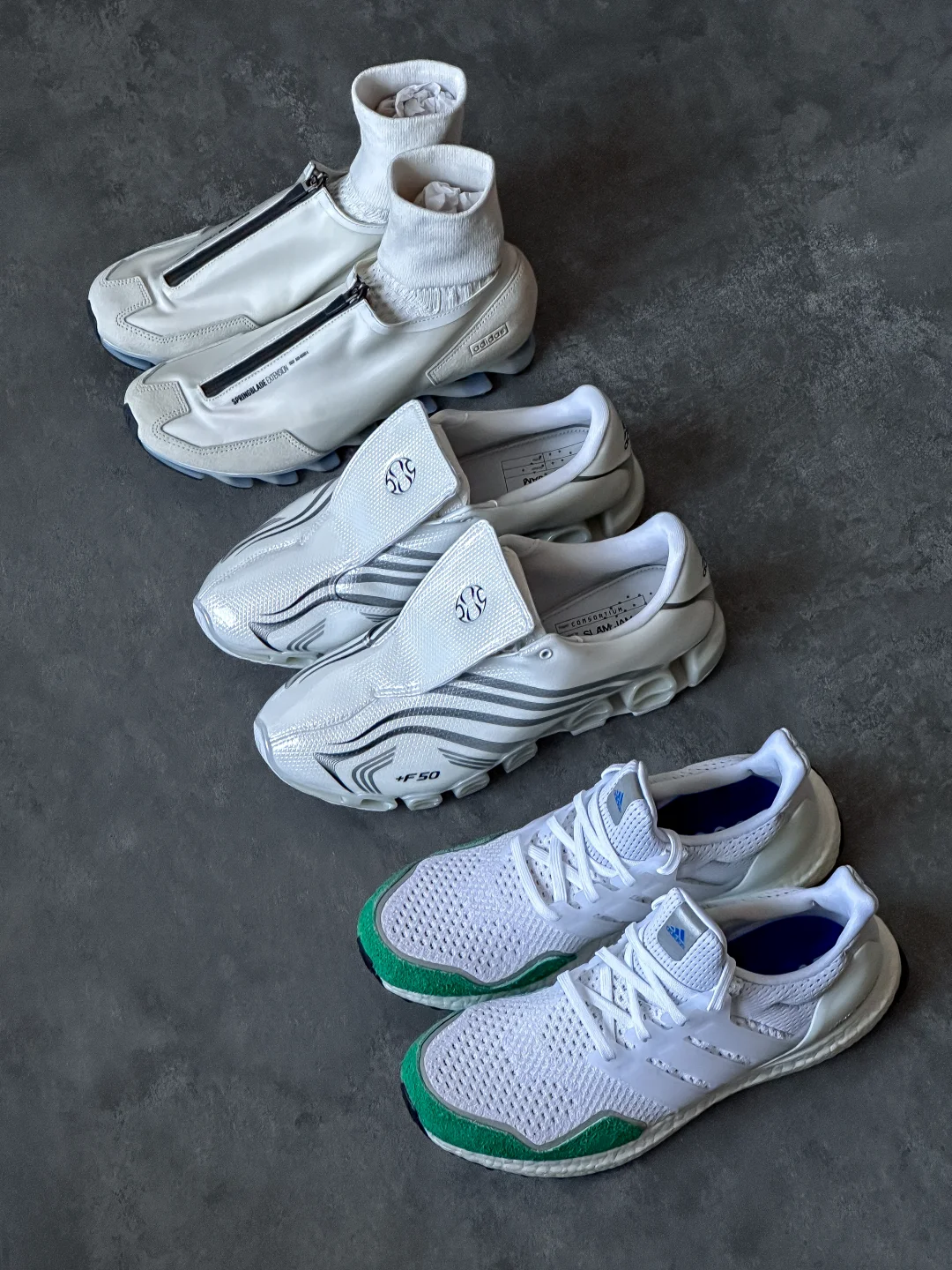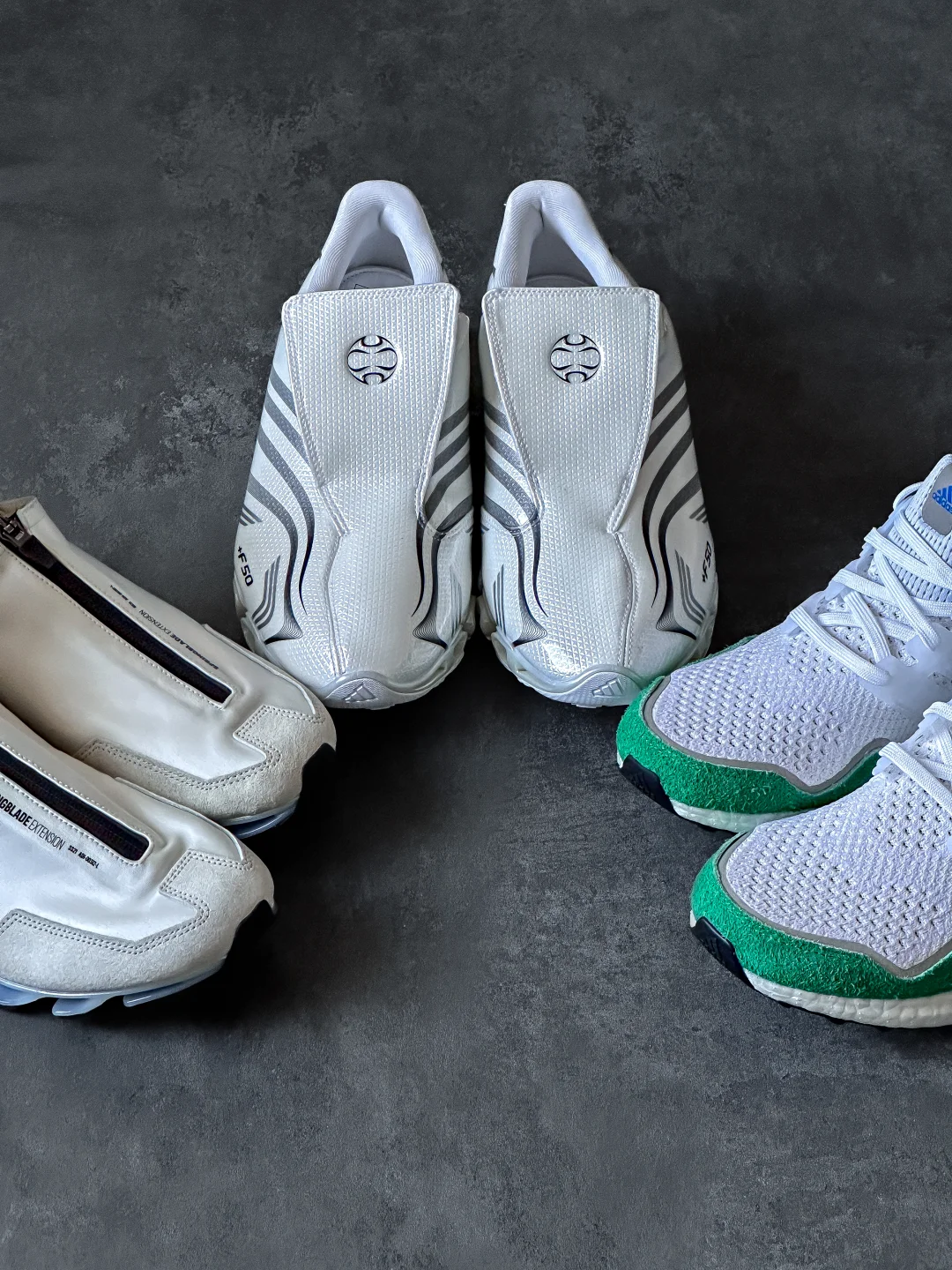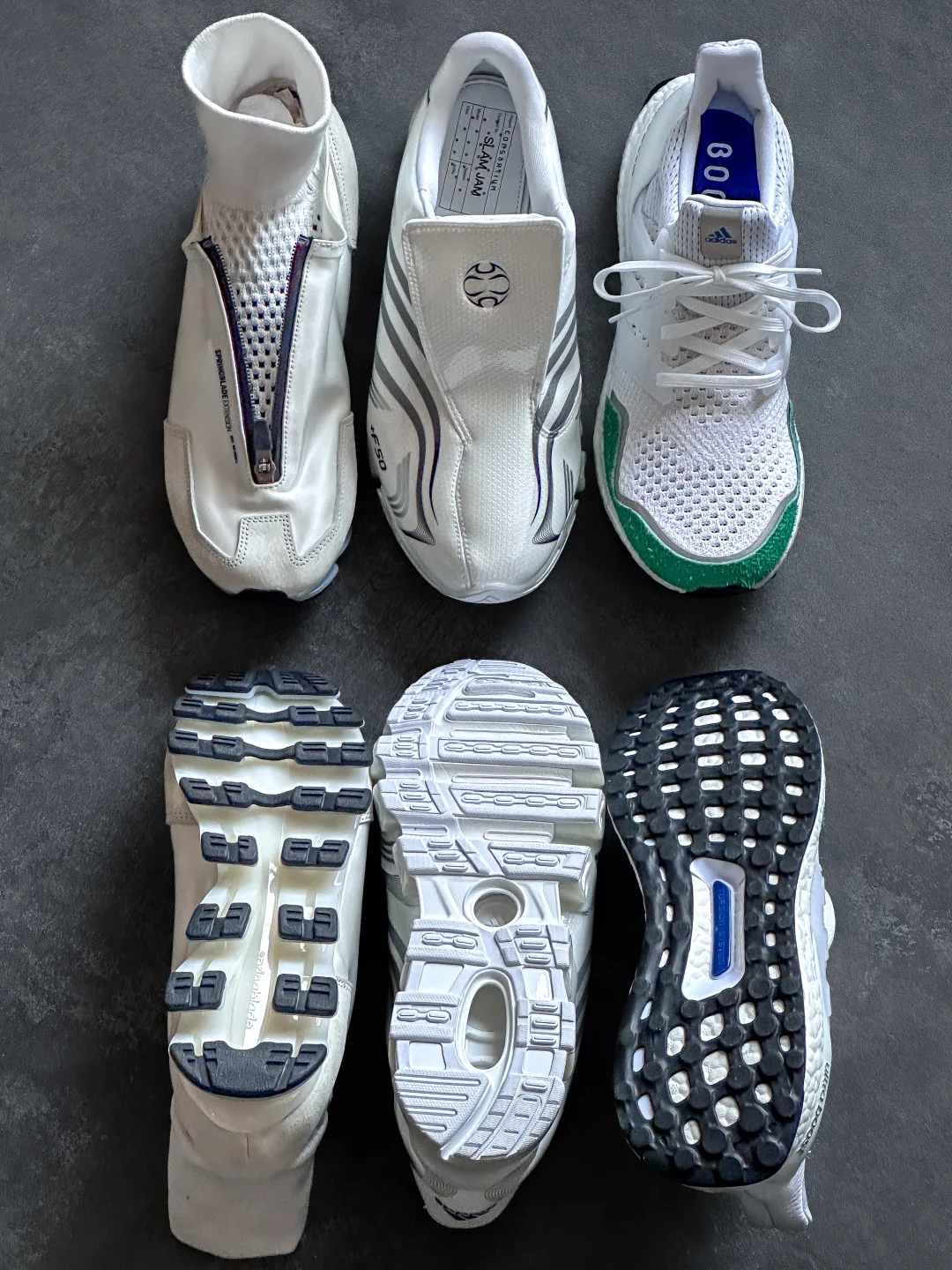 最近二十多年里,adidas带来过众多缓震技术。 不过要论让人印象深刻,可能还要算这三个:Megaride(曾经的a3)、Springblade刀锋、Boost。 这三个代表性的缓震技术外形都很有特点: -这双Megaride来自于Slam Jam与adidas的联名F50 Tunit,把F50的足球鞋基因🧬嫁接在科技感十足的Mega大底上,有了全新的生命力。 -这双Ultraboost也是被Jerry Lorenzo频繁上脚的一双,只是把纯白UB的鞋头变成了绿色🎾翻毛,简单但是特色十足。 -这款刀锋则是我认为最具时尚气质的一款,采用了双层鞋面+袜套的设计,整双鞋利落干脆,鞋面的拉链也为整双鞋增加了恰到好处的机能元素🦾。