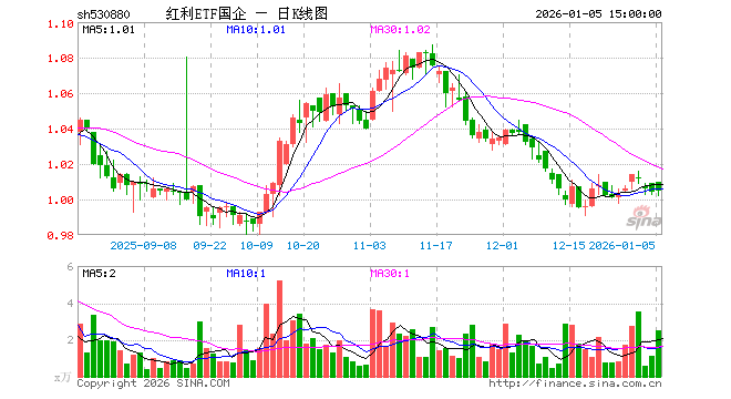 1月5日,红利ETF国企(530880)涨0.10%,成交额253.79万元。当日份额减少50.00万份,最新份额为5483.60万份,近20个交易日份额增加350.00万份。最新资产净值计算值为5508.82万元。