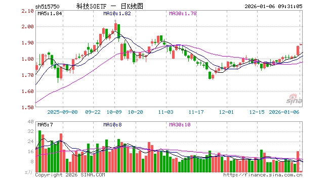 1月6日,科技50ETF(515750)开盘涨0.32%,报1.884元。科技50ETF(515750)重仓股方面,立讯精密开盘涨0.56%,阳光电源涨0.10%,亿纬锂能涨0.72%,歌尔股份涨0.85%,宁德时代涨0.66%,长川科技涨1.79%,烽火通信涨1.96%,寒武纪跌0.72%,领益智造涨1.00%,鹏鼎控股跌0.04%。