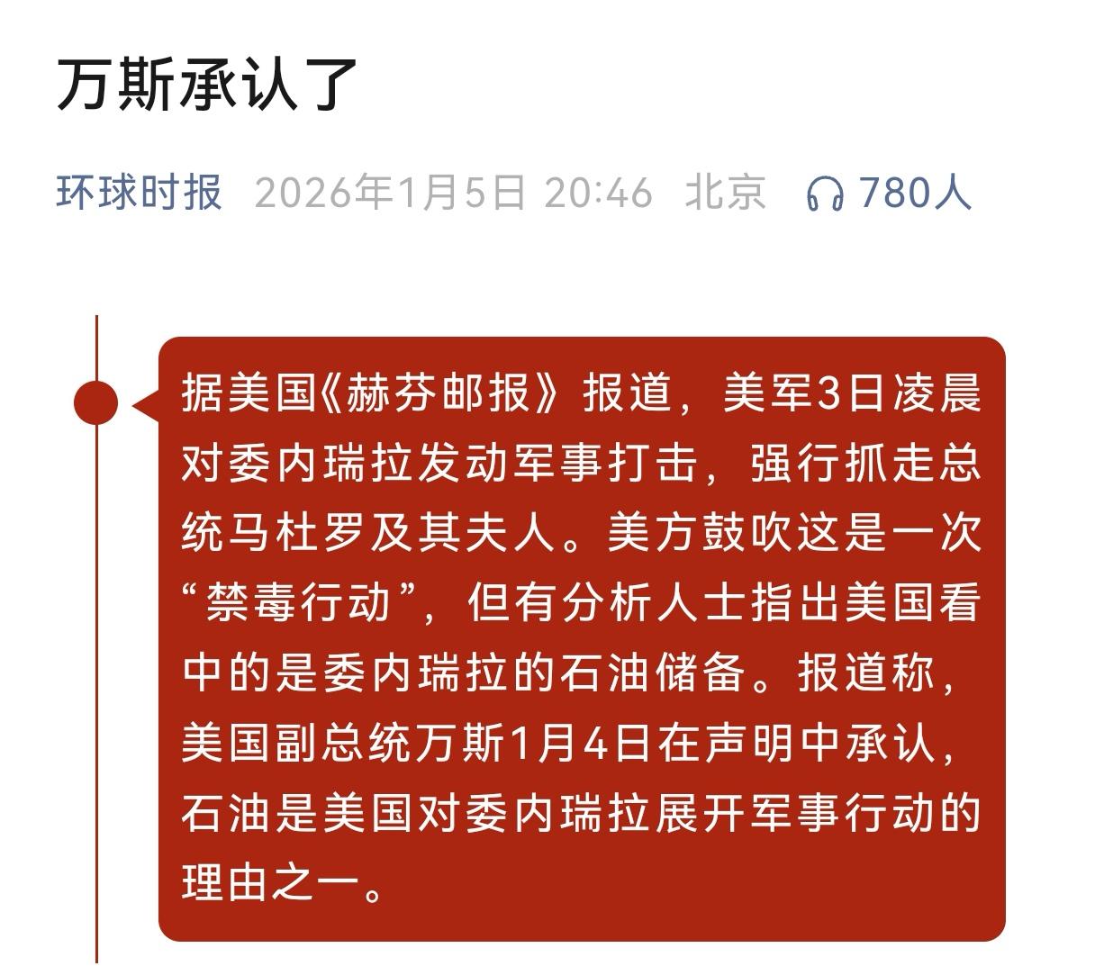 美副总统万斯住所遭袭击!这仅仅是一个开始 当地时间1月5日凌晨,俄亥俄州的辛辛那提。那个被特朗普一手提拔上来的副总统J.D.万斯,家里的窗户被人砸了个稀巴烂。 虽然万斯当时运气好,带着家人躲出去了,没在现场,但那个试图闯入的26岁小伙子威廉·德福尔,可是抱着必死的决心去的。 这事儿发生后,万斯在社交媒体上倒是挺淡定,说这是个“疯狂的人”干的,还假惺惺地感谢了一番特勤局。 可明眼人都看得出来,这哪里是什么简单的治安案件,这分明就是美国社会内部撕裂的血淋淋的伤口。 为什么这么说?咱们得把时间轴往前拨两天。就在1月3日凌晨,特朗普政府干了一件让全世界都瞠目结舌的事儿。 美军特种部队,居然像黑帮绑票一样,直接冲进了委内瑞拉总统马杜罗的官邸。 这场行动仅仅用了不到四个小时,就把一个主权国家的民选总统连同夫人一起,抓到了美军的“硫磺岛”号两栖攻击舰上。 不得不吐槽一下,这就是美国人所谓的“文明”和“秩序”。特朗普随后还在网上晒出了马杜罗戴着手铐、蒙着眼的照片,那副得意洋洋的嘴脸,简直把“强盗”两个字刻在了脑门上。 理由呢?还是那个老掉牙的“毒品恐怖主义阴谋罪”。说白了,不就是看上了人家委内瑞拉地底下的石油吗? 特朗普甚至都不装了,直接宣布美国要“管理”委内瑞拉,美国的石油企业马上就要进场。这吃相,真的是连遮羞布都不要了。 然而,天道好轮回,苍天饶过谁。特朗普以为靠着枪炮和特种部队就能在拉美为所欲为,但他忘了,暴力是会传染的。 当一个国家的领导人,在国际舞台上公然践踏规则,用绑架和暗杀来解决问题时,他其实就在向自己国内的民众传递一个信号:只要拳头硬,什么都可以干。 于是我们看到,就在马杜罗被押往纽约受审的短短两天后,暴力的回旋镖就扎到了万斯的家门口。 大家别忘了,就在几个月前,特朗普自己的耳朵都被子弹给打穿了。那时候也是有人高呼要“除掉暴君”。如今,万斯作为特朗普最忠实的“看门狗”,自然也就成了愤怒民众的出气筒。 那个砸窗户的年轻人,或许在官方通报里是个“疯子”,但在很多反感特朗普倒行逆施的美国人眼里,他可能就是个敢于反抗的“勇士”。 更有意思的是,美国国内现在的反应简直就是一锅乱炖。前副总统哈里斯和纽约市长这些民主党的大佬们,虽然嘴上说着谴责暴力,但字里行间都在暗示:这都是特朗普自找的。 哈里斯更是直言不讳,说特朗普在委内瑞拉的行动,关乎的只是石油利益和他个人的政治野心。这种公开的拆台,说明美国政坛的裂痕已经大到了无法弥合的地步。 其实,早在去年下半年,美国国内的政治暴力就已经有了抬头的趋势。从政治活动家在大学演讲时被杀,到州议员遭遇枪击,美国社会早就成了一个随时可能爆炸的高压锅。 特朗普这次在委内瑞拉的“军事冒险”,无异于在这个高压锅底下又添了一把猛火。 国际社会的眼睛是雪亮的。巴西总统卢拉直接把美军的行动定性为“绑架”,联合国秘书长也警告这是“危险的先例”。但特朗普会在乎吗?显然不会。 在他那个充满了“门罗主义”霉味的脑子里,拉美就是美国的后花园,想怎么折腾就怎么折腾。 这种让人类社会倒退几千年的野蛮行径,居然在2026年的今天堂而皇之上演,不得不说是一种巨大的讽刺。 但是,有远见的美国人已经开始害怕了。他们害怕的不是委内瑞拉的报复,而是担心这种无法无天的行事风格,最终会反噬美国自己。 现在的美国,看似在海外耀武扬威,实则内部虚弱不堪。两党势同水火,民众对立情绪严重,法律被政治玩弄于股掌之间。 特朗普想用一场对外战争的胜利来转移国内矛盾,这招数在几十年前或许管用,但在信息高度发达的今天,只会加速矛盾的爆发。万斯这次是运气好,没在家,那下次呢? 可以预见的是,随着马杜罗在纽约受审的闹剧开场,美国国内的抗议和骚乱只会越来越多。 那些反对特朗普霸权政策的人,那些对现状不满的人,甚至那些仅仅是想发泄怒火的人,都会被卷入这场漩涡。