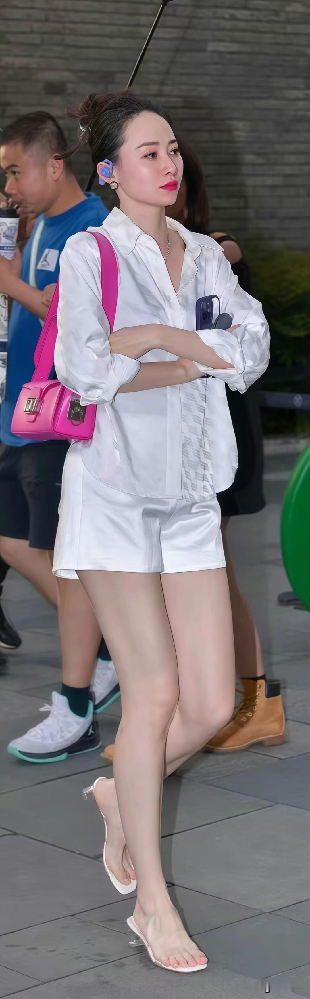 一身白色缎面套装清爽又利落,玫红色包包当配饰,瞬间点亮了整体穿搭,超吸睛~