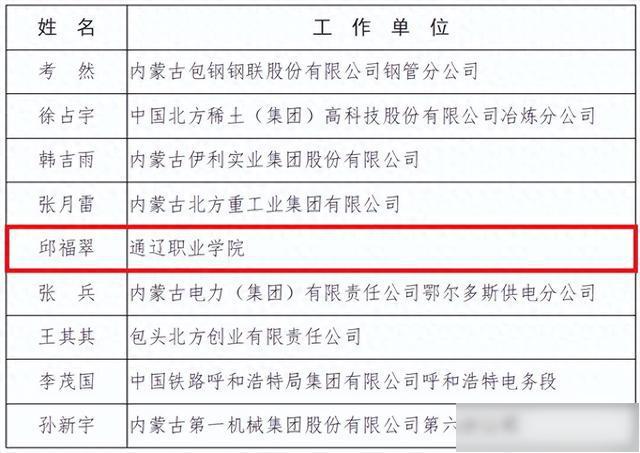 近日,内蒙古自治区人民政府发布《关于表彰奖励第二届“内蒙古自治区技能大奖”获奖人员的通报》(内政字〔2025〕211号),其中,通辽职业学院邱福翠老师入选。