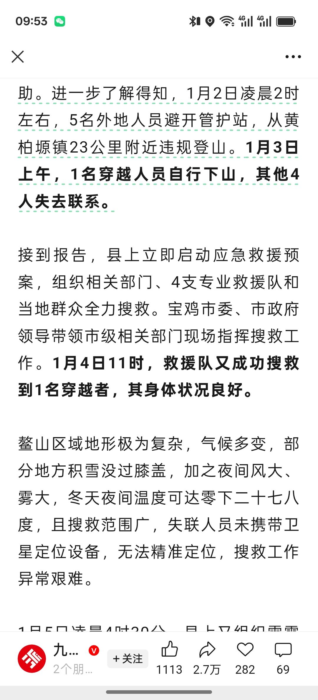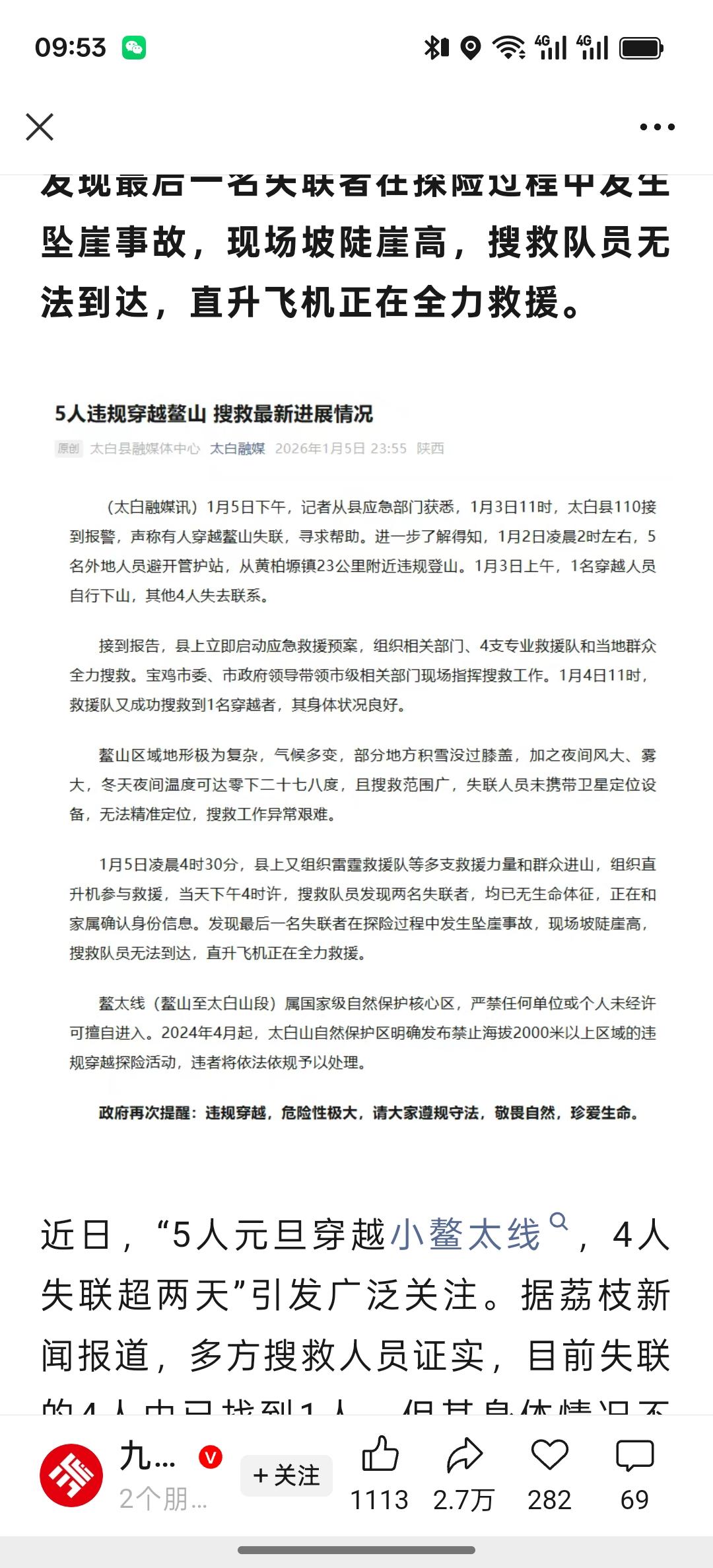 ”自杀式"登山,到底是为了什么? 2026年元旦,五位女网友相约穿越秦岭小鳌太线,而这一地区早已被列为国家级自然保护区,禁止搞穿越活动。为此,她们特地不带帐篷,更没有卫星电话,绕过检查站,想要一日穿越成功。 结果就是两人遇难,一人坠崖生死未卜,一人冻伤获救,一人迷途知返。真是惨痛的教训啊!这条穿越线海拔挺高,气候恶劣,冬季常年零下二、三十度,什么有效的装备都不带,这不是妥妥的自杀吗? 鳌太线的穿越活动,有统计的死亡人数有40多人,这还不能警醒某些驴友吗?穿越的意义是什么?是要证明自己还是要征服大自然? 如果要证明自己,那有很多安全方式,如果要征服自然,纯属痴人说梦!