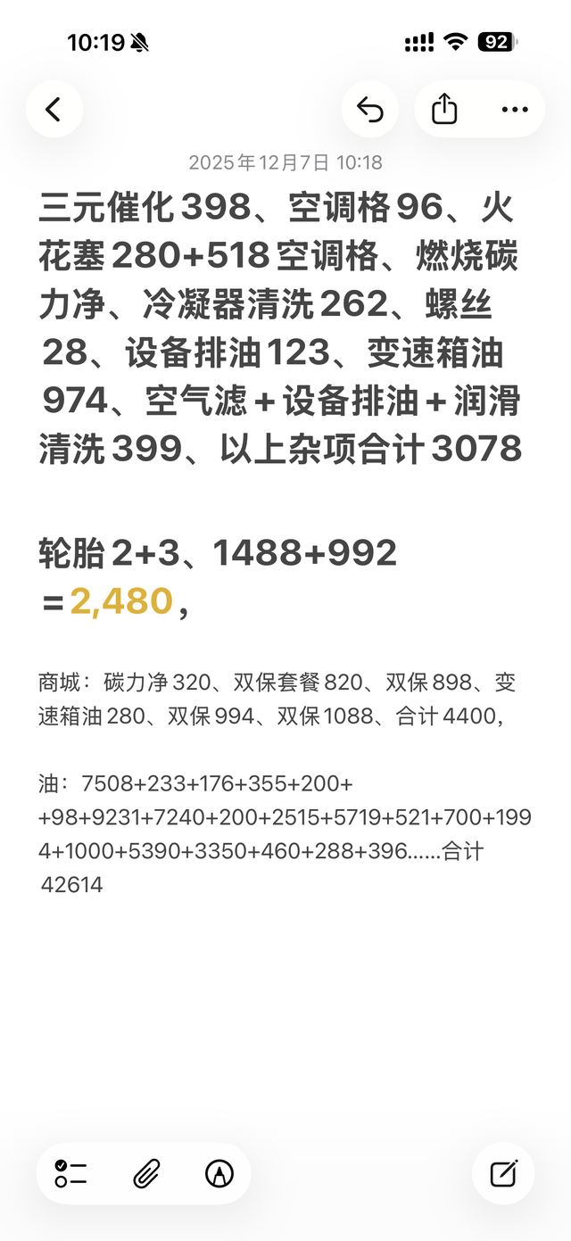 全程4儿子店保养5年8.6万公里费用合计 1、常规保养费用:五年双保共计十次,实际有效的是9次,管到50000公里,2000块钱;买了4个2次保养套餐,管到90000公里,3800块;至今总合计5800块; 2、其他换件等保养费用:如图,各种清洗排油等合计3678,轮胎5个2480,但是我是刮破了才换这么多,总合计6158; 第一二项合计11958块,可以算作是9万公里的全部保养开支。 3、重头戏,油费:表格中已经列明是42614块,对应86800公里,当然我还有一箱满的还没扣出来,算他42300块吧,整个用车周期折合下来大约就是四毛八九一公里,算高速市区郊区各三分之一。数据统计可能有出入但是出入很小,主要是加油便宜,95的油,固定优惠5毛,周五额外优惠2毛,最近一次加油是6.57的价。全程统计的平均车速大约41。 4、保险:新车第一年5800,第二年4200,第三年3700,第四年5600,第五年3700,有出险没办法,第六年的马上也快要买了,没出险还会降,一直买的全险;