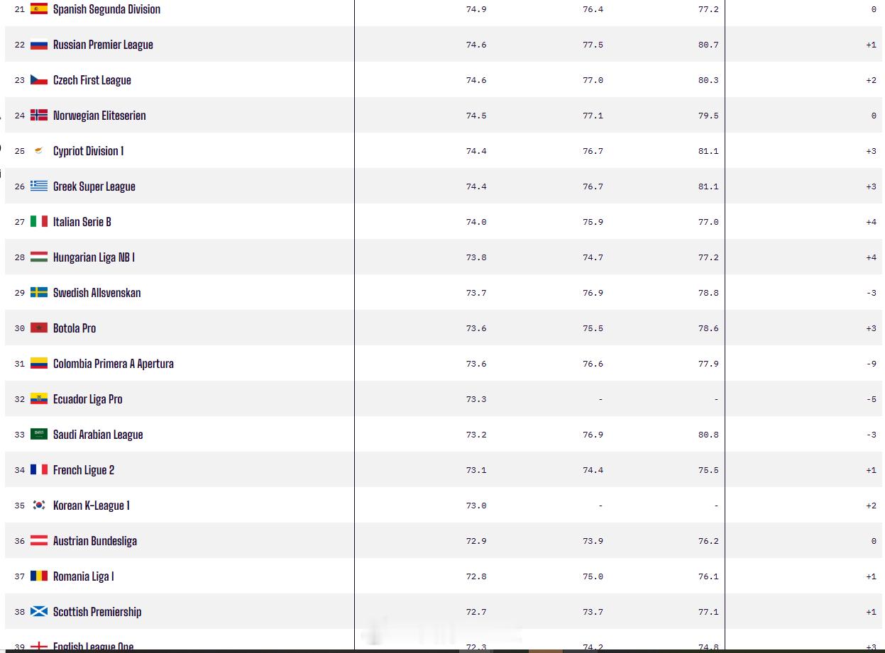 OPTA新年世界联赛实力排名:英德意西法,英冠,葡比巴丹。美波阿日荷,克土,德乙,瑞墨……上田都射手王了,日本超越荷甲也合理俄超22,沙超33,法乙34,K1联赛35,伊朗48,西协甲51,乌超56,阿联酋60,赛超65,日乙68,乌兹别克100,科威特108,K2联赛111, 115,卡塔尔119,越南124,泰超138,印尼155,日丙178,港超231……