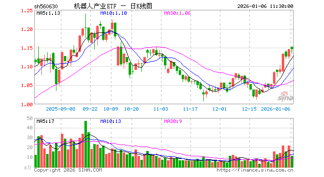 1月6日,截止午间收盘,机器人产业ETF(560630)涨0.00%,报1.145元,成交额1300.66万元。机器人产业ETF(560630)重仓股方面,汇川技术截止午盘跌0.14%,科大讯飞涨0.00%,石头科技涨2.57%,大华股份涨0.42%,中控技术涨0.06%,大族激光跌0.96%,双环传动跌1.49%,科沃斯涨0.10%,机器人跌0.70%,云天励飞涨0.54%。