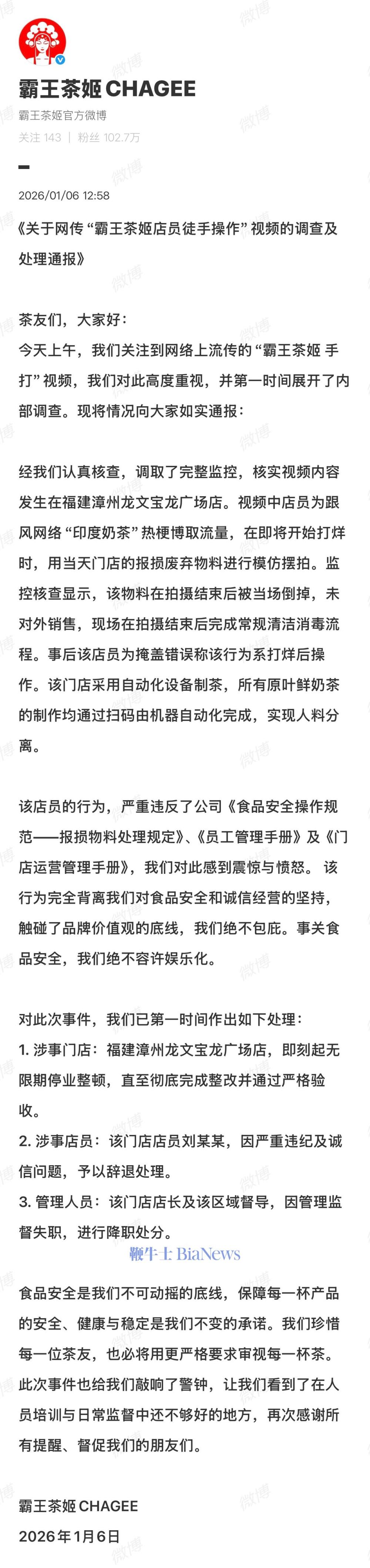 1月6日,霸王茶姬发布《关于网传“霸王茶姬店员徒手操作”视频的调查及处理通报》。