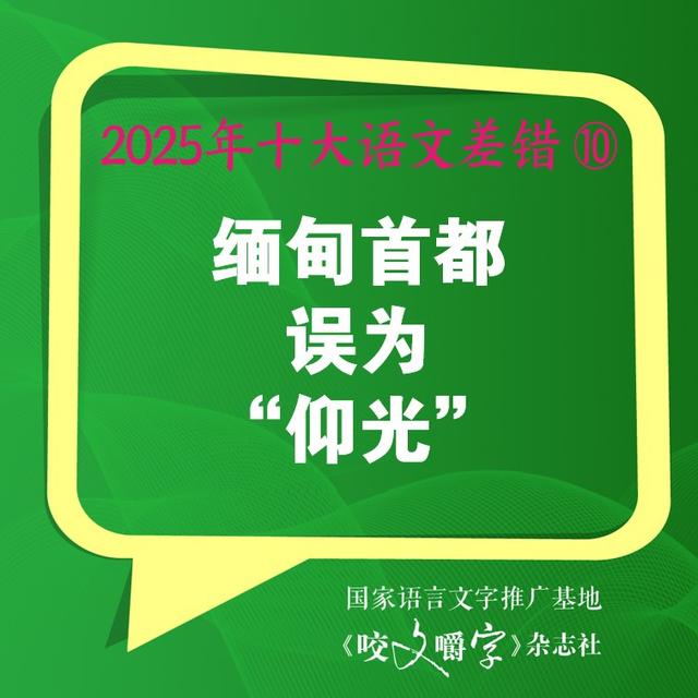 第三,关注语用变化。语文规范具有“时间性”,不同时代有不同时代的语文规范,甚至同一时代的不同时间段规范也有可能有变化。比如,1955年《第一批异体字整理表》发布后曾以“撅嘴”为规范词形,但2013年《通用规范汉字表》发布后写作“噘嘴”才规范。再如,1948年缅甸脱离英联邦独立后定都仰光,但2005年11月已将首都迁往内比都。多年来,我们都以发展的眼光看待语文规范;在“2025年十大语文差错”评选工作中,我们同样也关注到了语文规范发展变化这一事实。