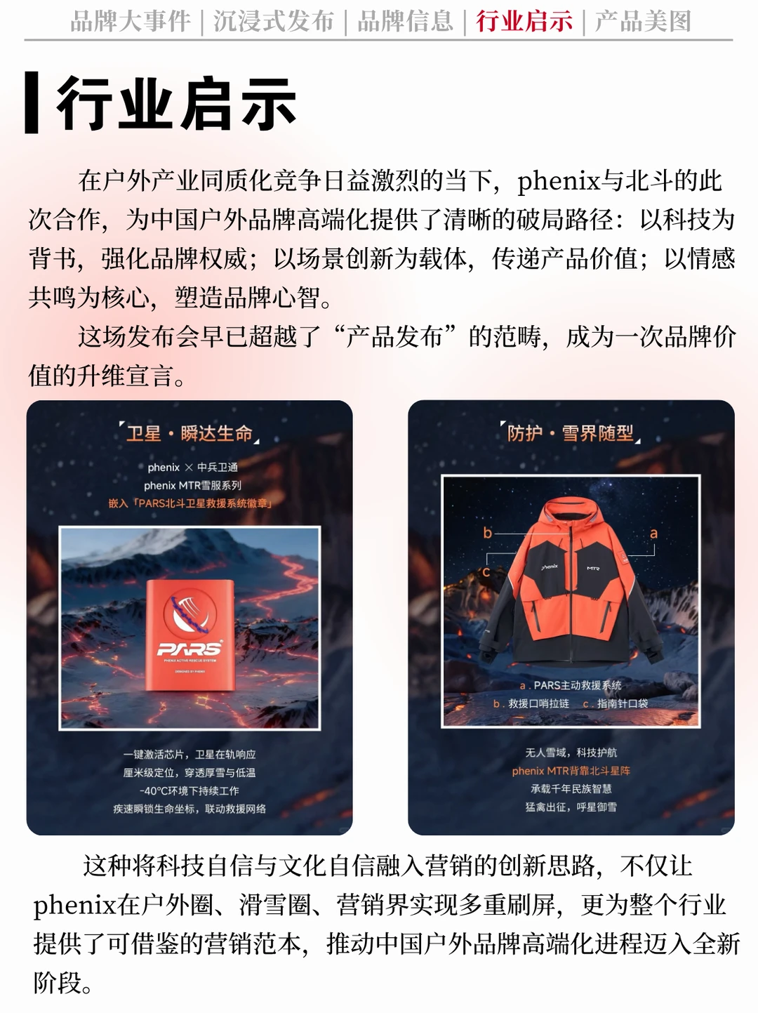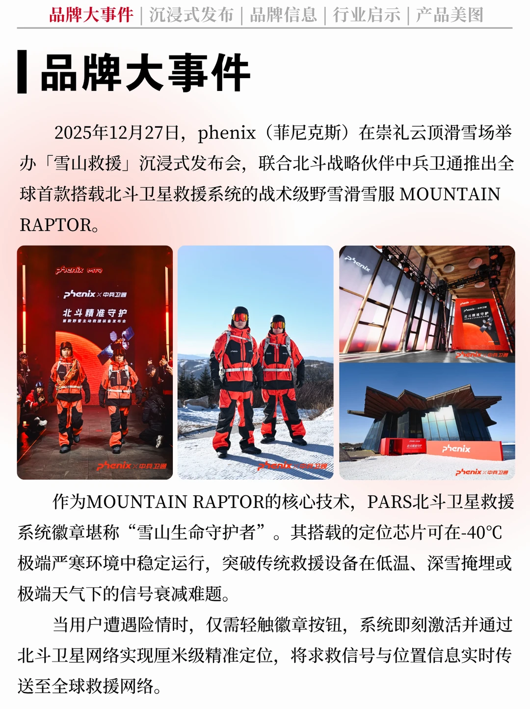 👍 这种深度参与的发布模式,不仅生动传达了产品"主动救援"的核心功能,更将"卫星守护"这一理念植入人心,打破了科技与用户之间的壁垒,让北斗技术与phenix滑雪服不再是冰冷的产品与技术,而是时刻陪伴、值得托付的"守护者"。